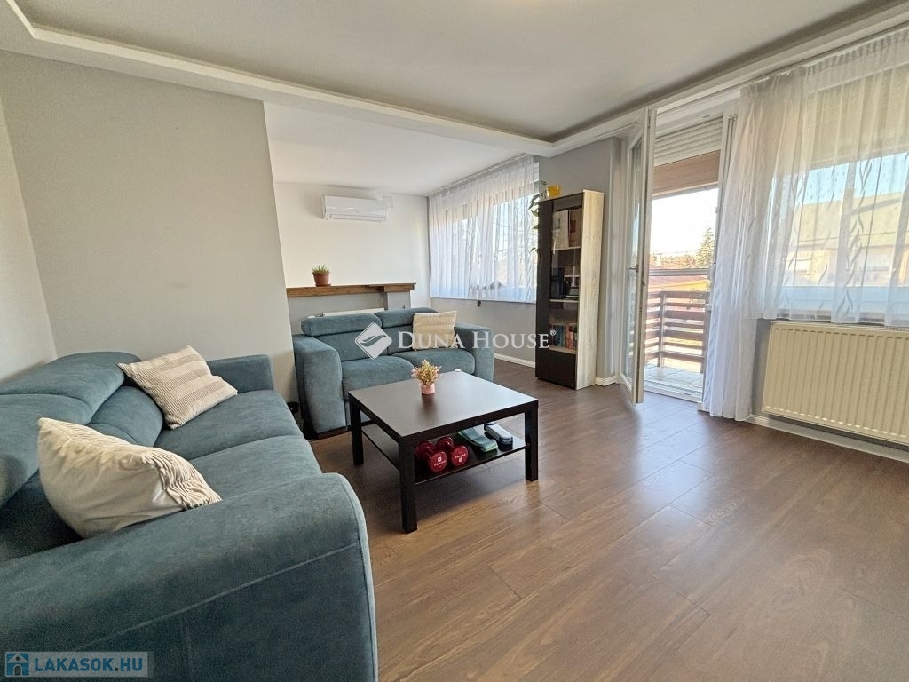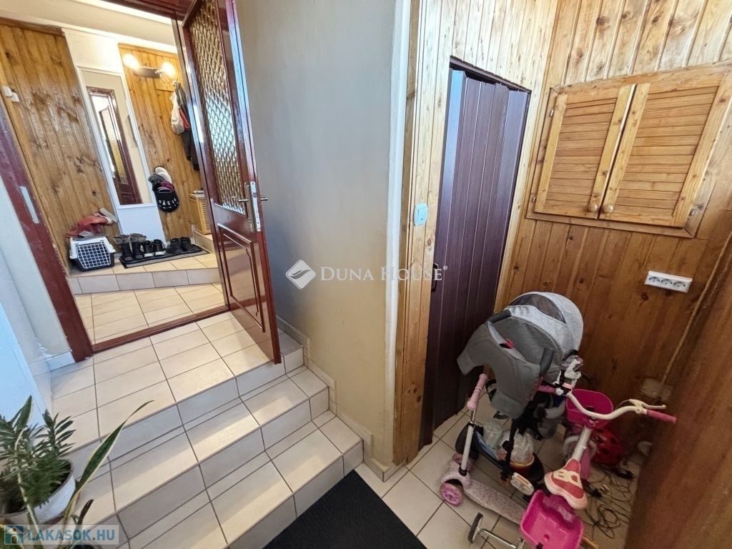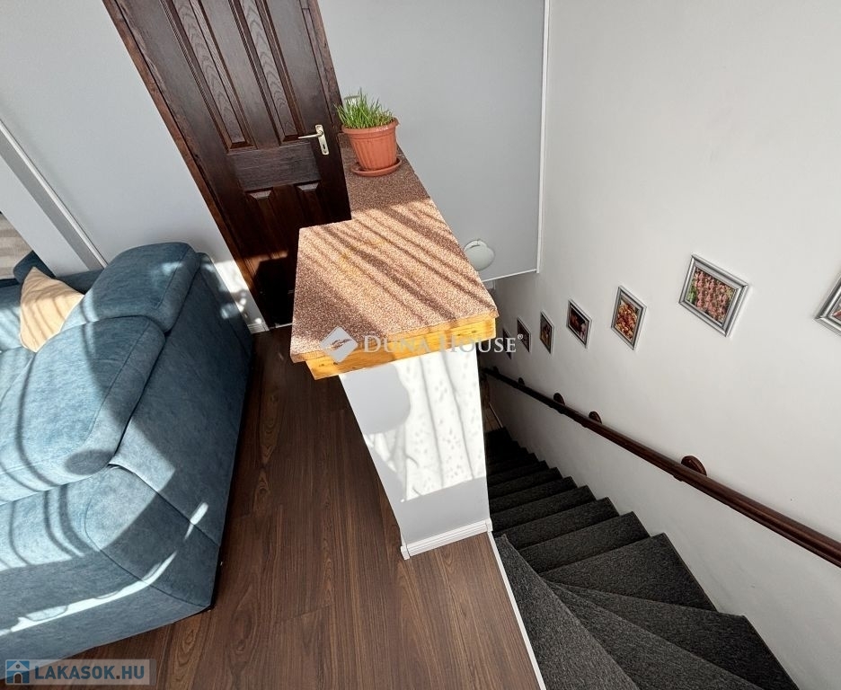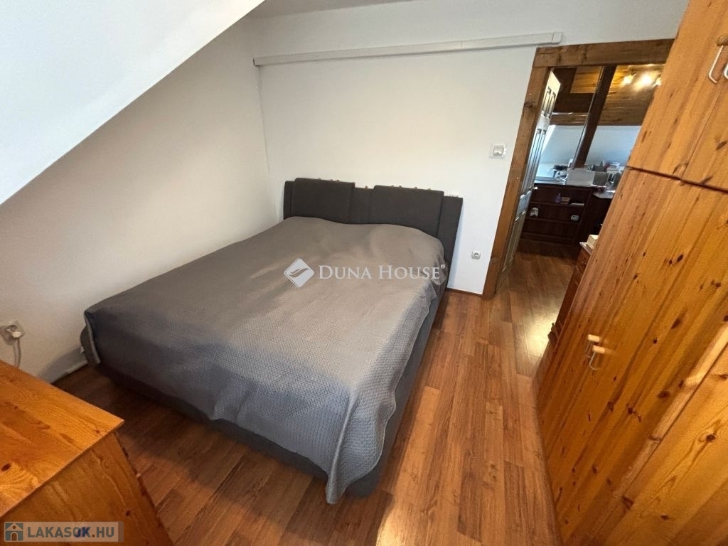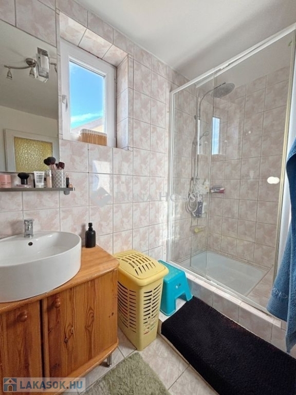 Szombathely kámoni városrészén jó állapotú, nettó 90 m2 alapterületű lakás eladó. Az ingatlan egy kétlakásos társasház utcafronti oldalára nyílik, ahol egy kis udvarrész is tartozik hozzá. A térkövezett udvaron parkolni is lehet egy autóval, további egy gépkocsival a kapu előtti hídon. A lakás nagyobb része két szintre osztott, az emeleten egy tágas világos nappali fedett terasszal és egy mellékhelyiség van kialakítva, a tetőtérben kapott helyet a két hálószoba, a konyha étkezővel, egy fürdő és egy kis háztartási helyiség wc-el. A földszinti bejárati részen van még egy kis tároló és az előszoba. Az ingatlan rendezett karbantartott állapotú, az elmúlt években megújult többek között a nappali, és a nyílászárók is korszerűsítve lettek, az ablakok redőnnyel és rovarhálóval is fel vannak szerelve. A tetőtéri ablakokat tavaly cserélték korszerűbbre.