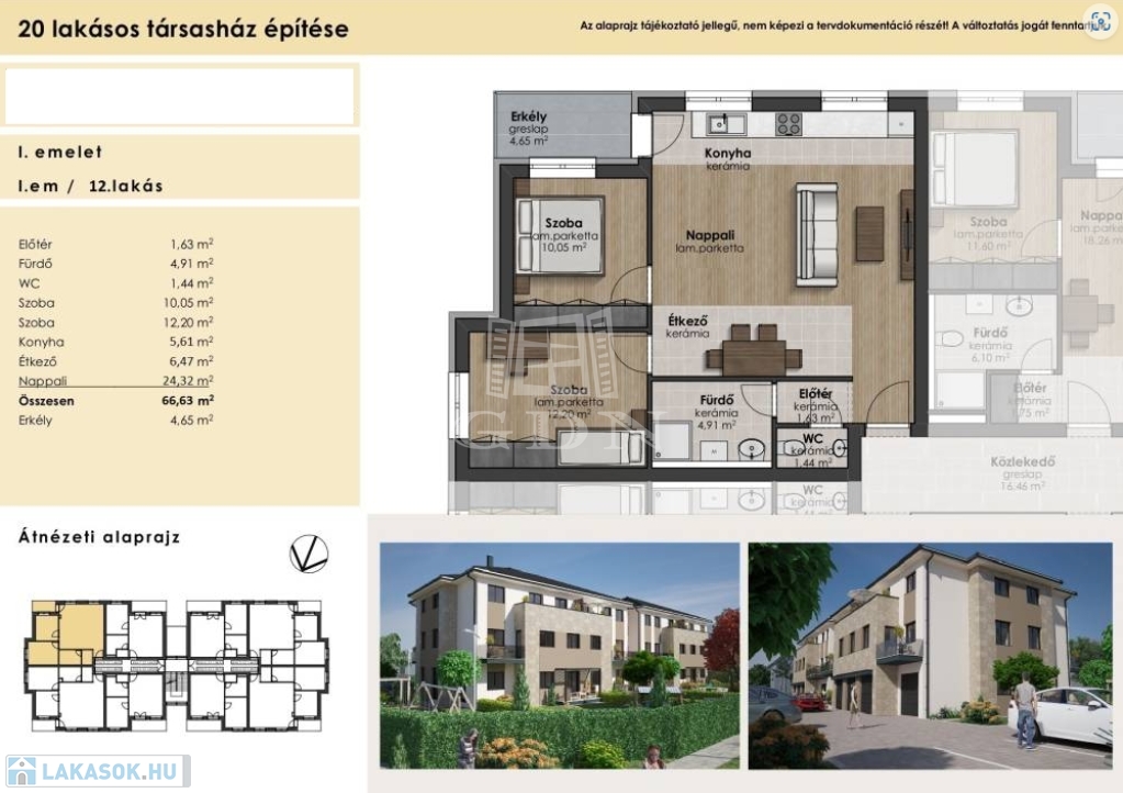 A három szintes kettő emeletes, 20 lakásos modern társasházak minden igényt kielégítő, magas műszaki tartalommal valósulnak meg. A kiváló tájolású 40-67 m2 közötti ingatlanokat nagyon jó elosztás és élhető terek jellemzik. A lakások nappali+egy , nappali +kettő szobásak lesznek. A földszinti lakások komfortérzetét teraszok, saját kertek az emeleti lakásokét jó méretű erkélyek fokozzák. Nyílászárói 3 rétegű fokozottan hő- és hangszigetelt üvegezésű műanyag ablakok és erkélyajtók, redőny fogadására alkalmas szemöldök kialakítással. A lakások bejárati ajtaja MABISZ minősítéssel rendelkező tömör, több ponton záródó biztonsági ajtó. Fűtése központi gázfűtés tervezett, kondenzációs gázkazánnal a lakásokban egyedi hőmennyiség szabályozással és mérővel, padlófűtéses hőleadással. Klímaelőkészítést a vételár magában foglalja. Hideg -meleg burkolatok ,szaniterek, csaptelepek, beltéri ajtók választhatók. Az ingatlanhoz felszíni parkoló, garázs vásárolható.