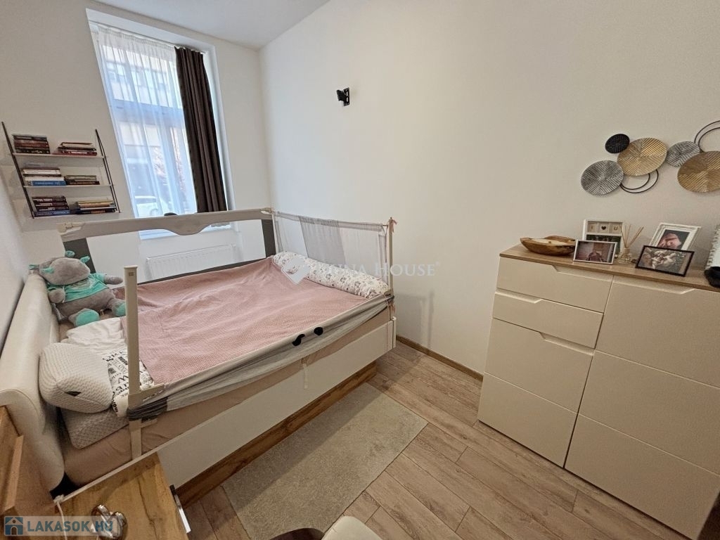 A lakásba a kapuszínből jutunk be, előszobájából nyílik a három utcafronti szoba, a fürdő-wc, a ház belső udvarára tájolt a konyha és a galériázott nappali, a galériából nyílik egy kisebb, zuhanyzós fürdő-wc. (összesen 80 m2 + a galériaszint). Az ingatlan 2010 és 2015 között teljes felújításon esett át, műszakilag is korszerűsítve lett, esztétikailag is hibátlan állapotban van. Fűtését gáz-cirkó kazán biztosítja, alternatívaként hűtő-fűtő klímaberendezést is felszereltek.