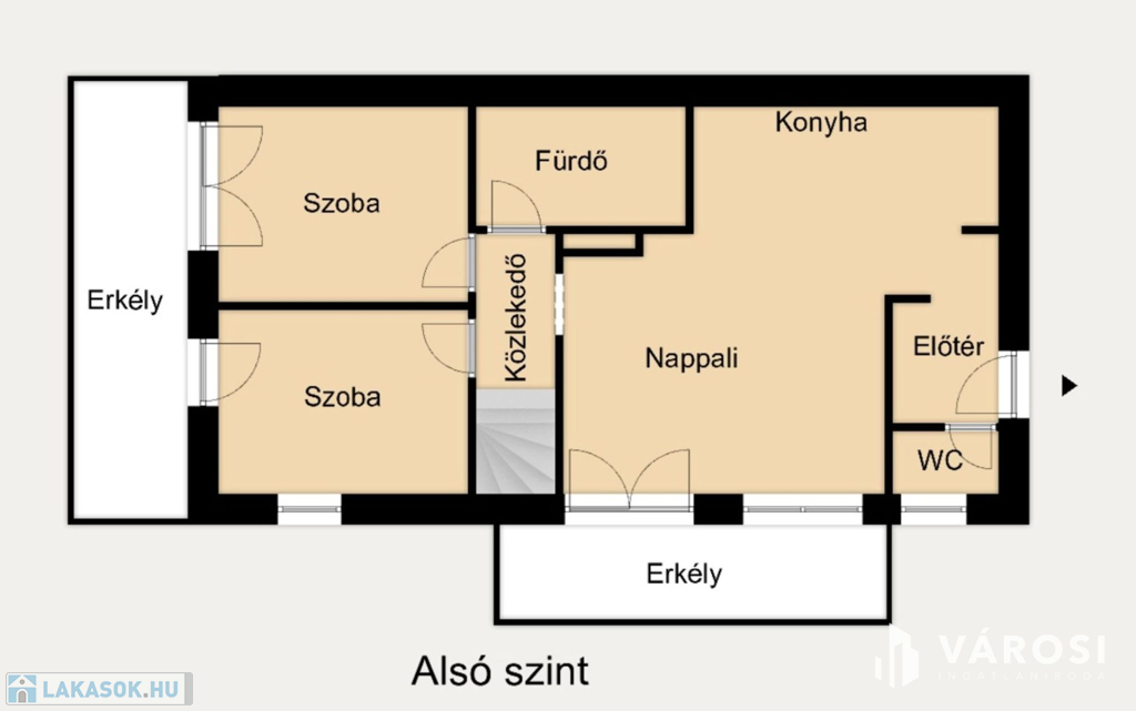 Az alsó szinten egy világos amerikai konyhás nappali, két kényelmes hálószoba, fürdőszoba, külön WC, háztartási helyiség, valamint két terasz biztosítja a tökéletes lakókomfortot.