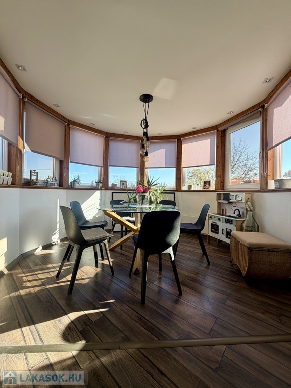 egy körbenapozott, toronyszerű étkezőrész, amely különleges karaktert ad a térnek, és igazán egyedivé teszi az ingatlant.