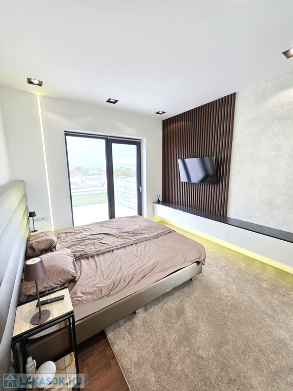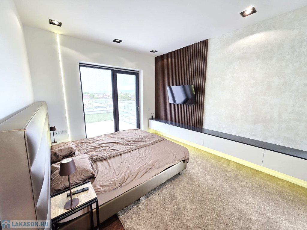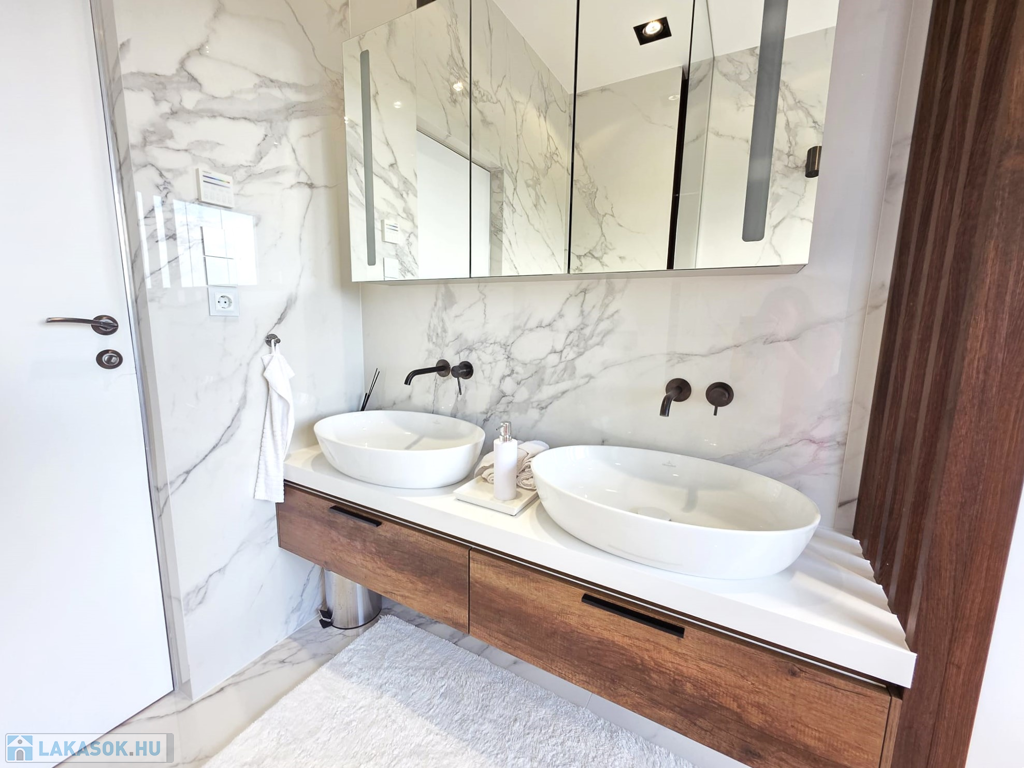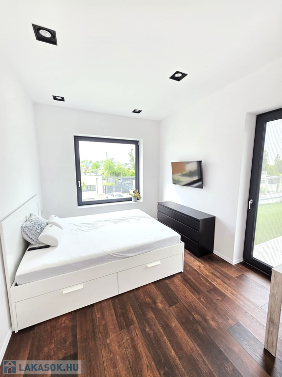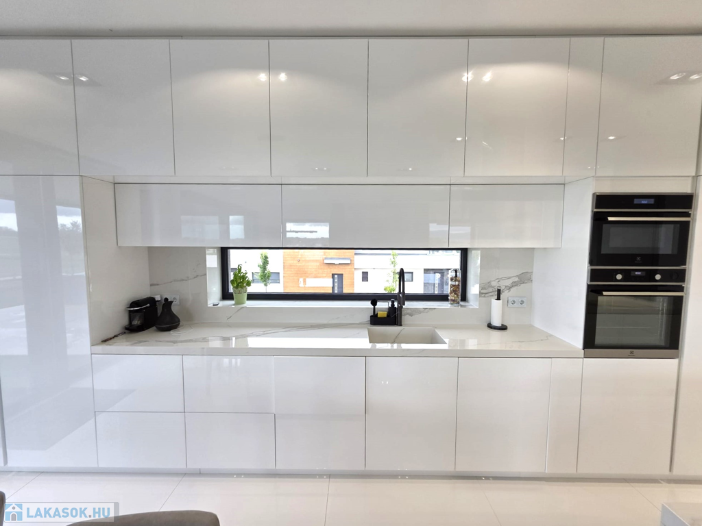 -2 hálószoba, 1 gardróbszoba, mosókonyha, tároló, külön fürdőszoba és mellékhelyiség, nappali, konyha, étkező egy légtérben.