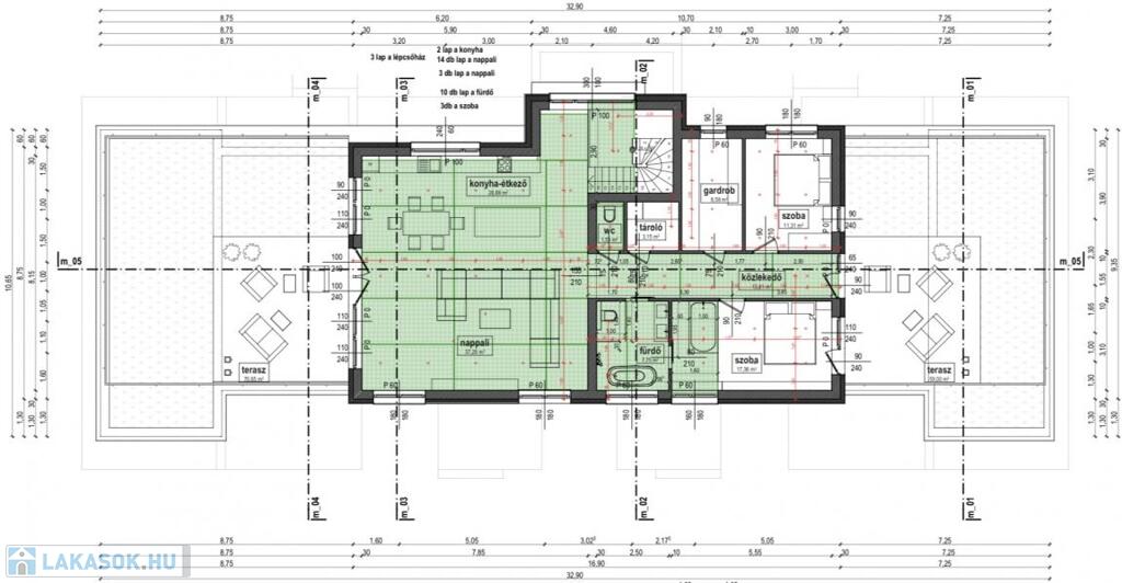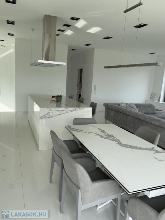 -Konyha + étkező egy légtérben található a nappalival. A nappaliból nyílik a 75m2-es terasz, melyet 120x120-as Atlas Concorde 2cm vastag kőporcelán és műfű borít és Alumínium Pergola fedi.