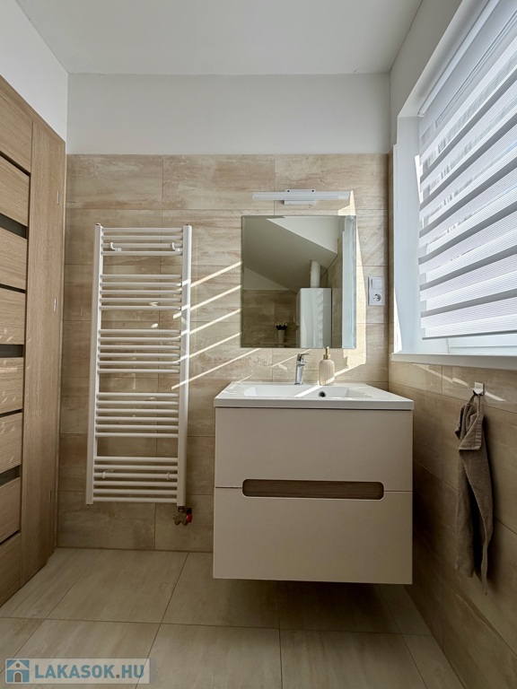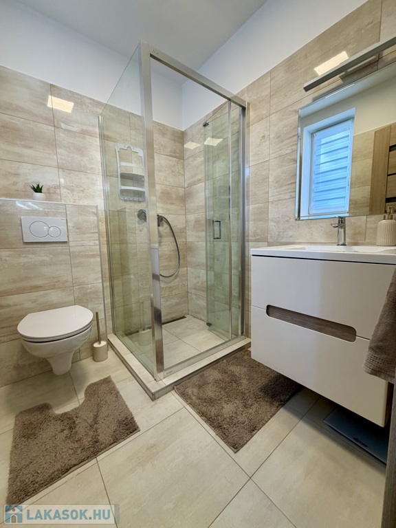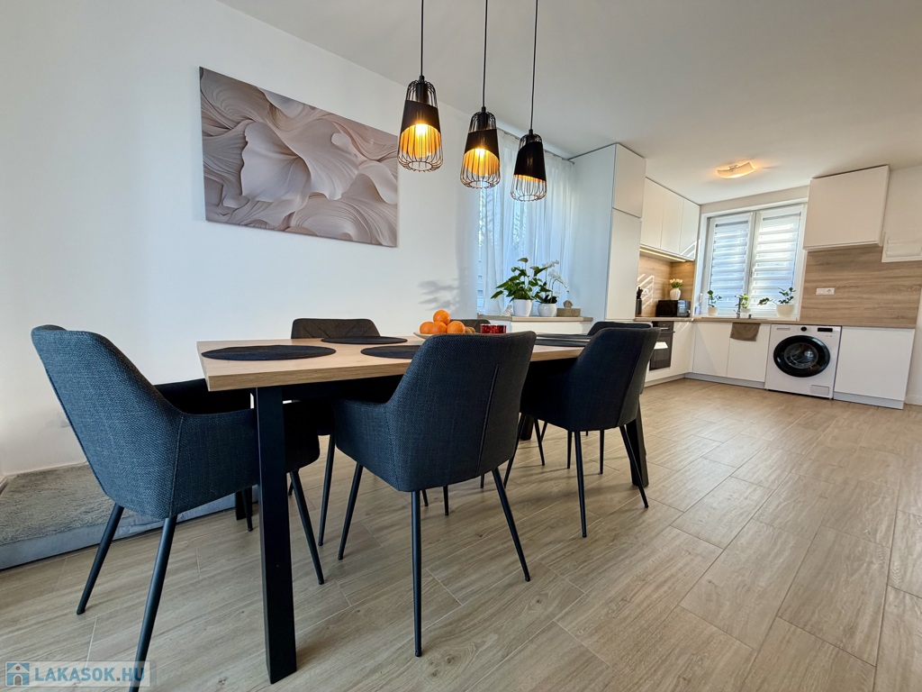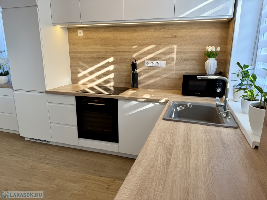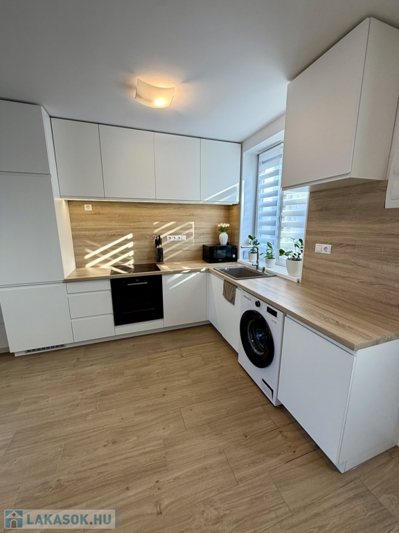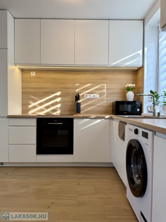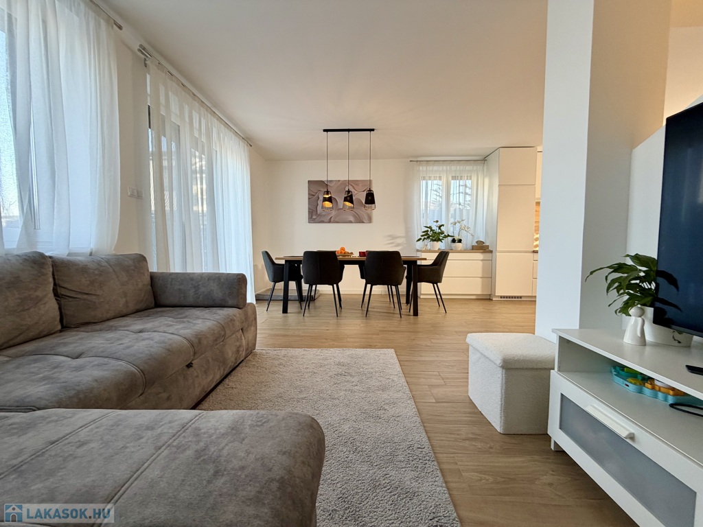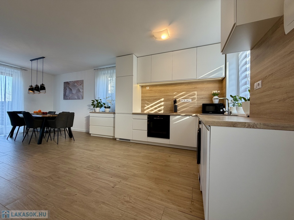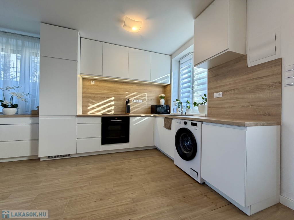 A 77 m²-es lakótér átgondolt, családbarát elrendezésű. Három hálószoba biztosítja a privát tereket a szülőknek és a gyerekeknek, míg a két fürdőszoba a mindennapokat teszi gördülékennyé. A világos, modern élettérhez teljesen gépesített, beépített konyha kapcsolódik, így az ingatlan nem igényel további jelentős beruházást.