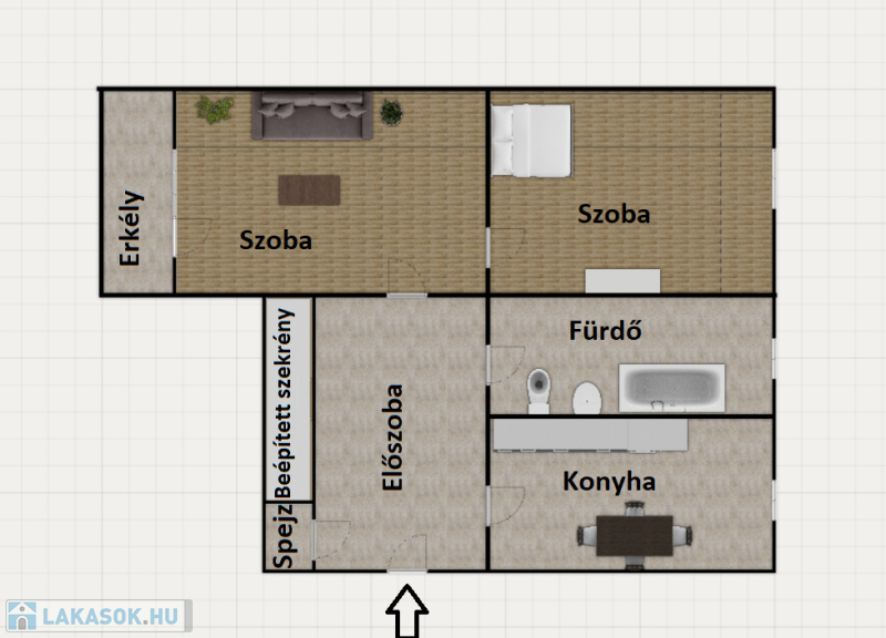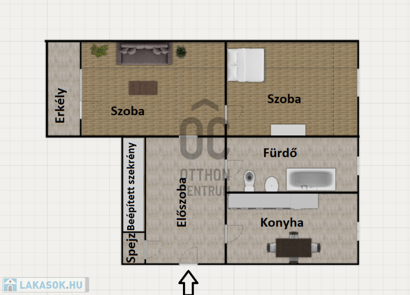 Az 55 négyzetméteres lakásban 2 szoba, konyha, fürdő-wc, egy előszoba es egy kamra is helyet kapott.