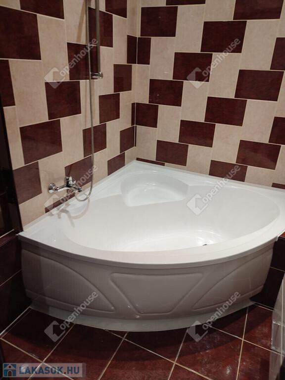 -A fürdőszoba sarokkáddal szerelt, a toalett külön helyiségben található.