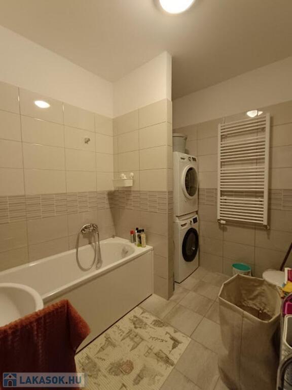 Fürdőszoba és WC: Minőségi és ízléses burkolatokkal ellátva, beépített zuhanykabinnal.