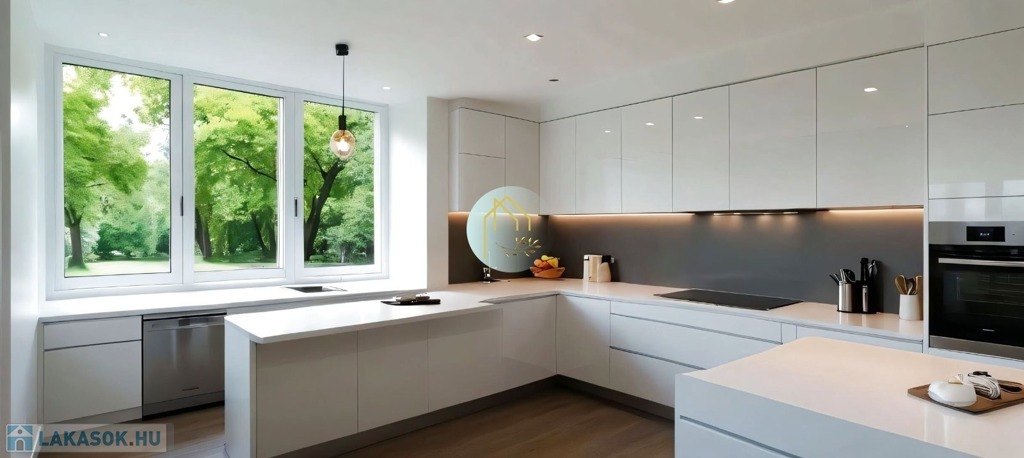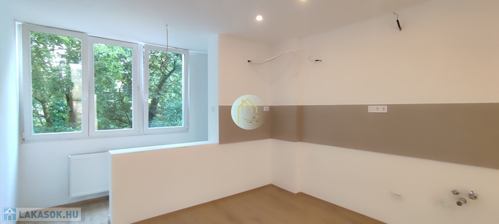 Konyhabútor helye kialakítva, víz kiállások, külön mosogatógépnek is, szennyvízelvezetés, gipszkartonos mennyezet led világítással felszerelt.