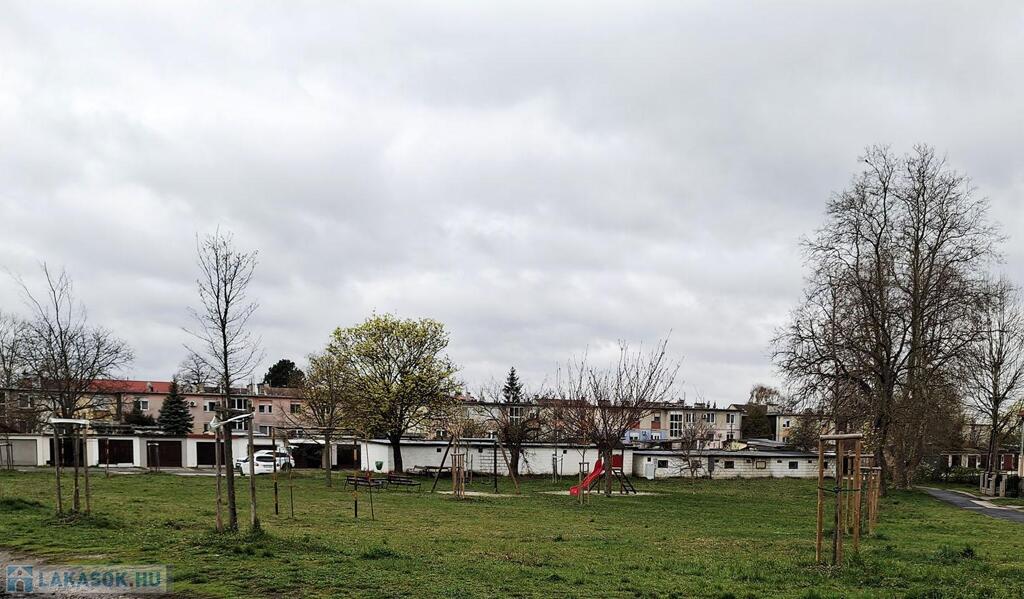 Az ingatlanhoz tartozik egy saját használatú kertrész, amely a teraszról is közvetlenül megközelíthető, valamint egy nagyméretű mobilgarázs, amely kerti tárolóként funkcionál.