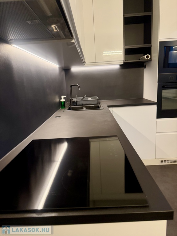 A konyha különösen figyelemreméltó: minőségi konyhabútor, praktikus elrendezéssel, beépített gépekkel (sütő, főzőlap, mikró, mosogatógép), amely így azonnal használatra kész.