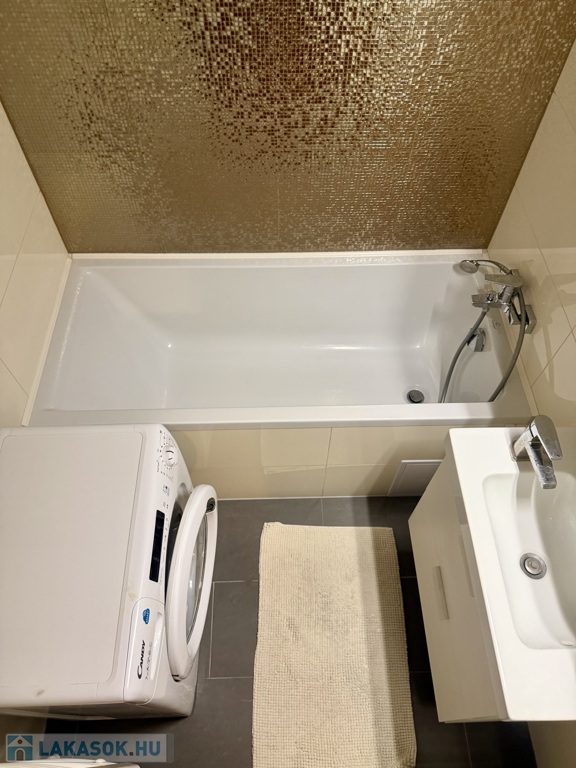 A fürdő és a WC külön helyiségben található, mindkettő modern burkolatokkal, Grohe-szerelvényekkel, a szellőzés elektromos vezérléssel lett megoldva.