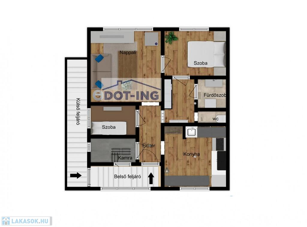 A lakásba saját feljárón keresztül érkezünk meg, melyben konyha, kamra, két szoba és egy félszoba található. A félszoba mellett kapott helyet a kamra, így a kettő helyiség egybenyitásával a félszobából egy nagyszoba alakítható ki. A fürdő és a WC külön helyiségekben találhatók, a fürdőszoba felújítása az új tulajdonosra vár. A lakáshoz padlástér is tartozik, amely a későbbiekben igény szerint akár beépíthető, ezzel plusz lakótérrel növelhető az ingatlan alapterülete.