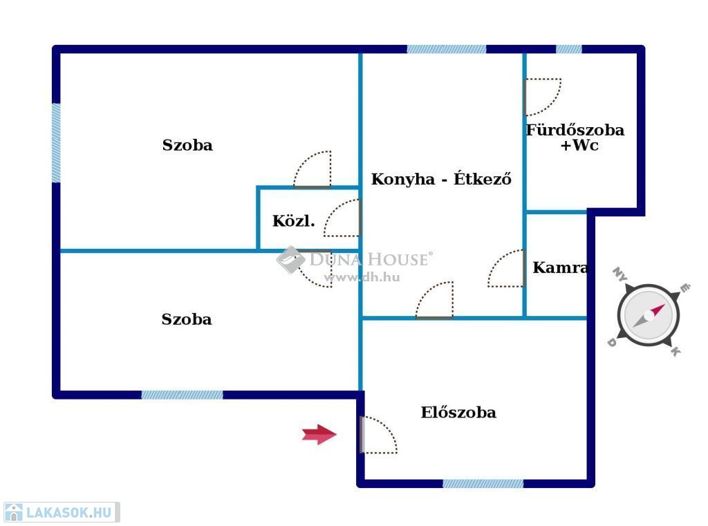 Az ingatlan 2 különnyíló szoba, egy étkezős, ablakos konyha, egy szintén ablakos fürdőszoba+wc, egy kamra, és egy előszoba helyiségek kaptak helyet. Elrendezése praktikus, kisebb családok, fiatalok, összeköltözők, párok, idősek számára is ideális lakóteret biztosít.