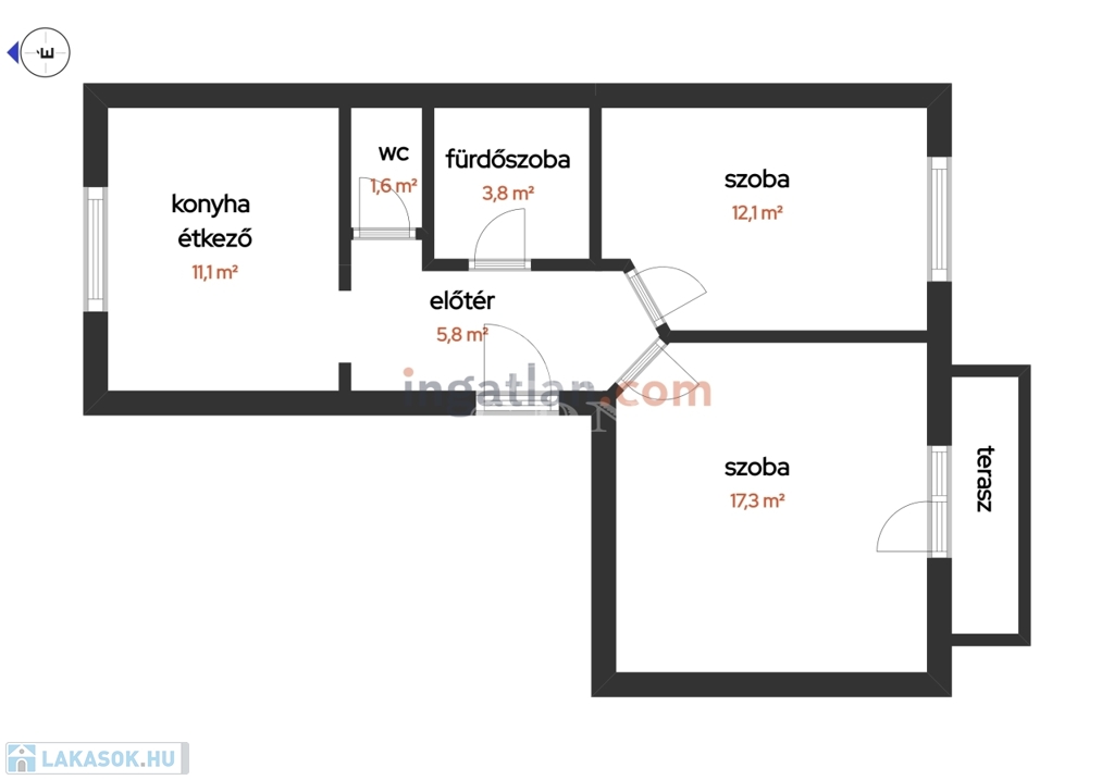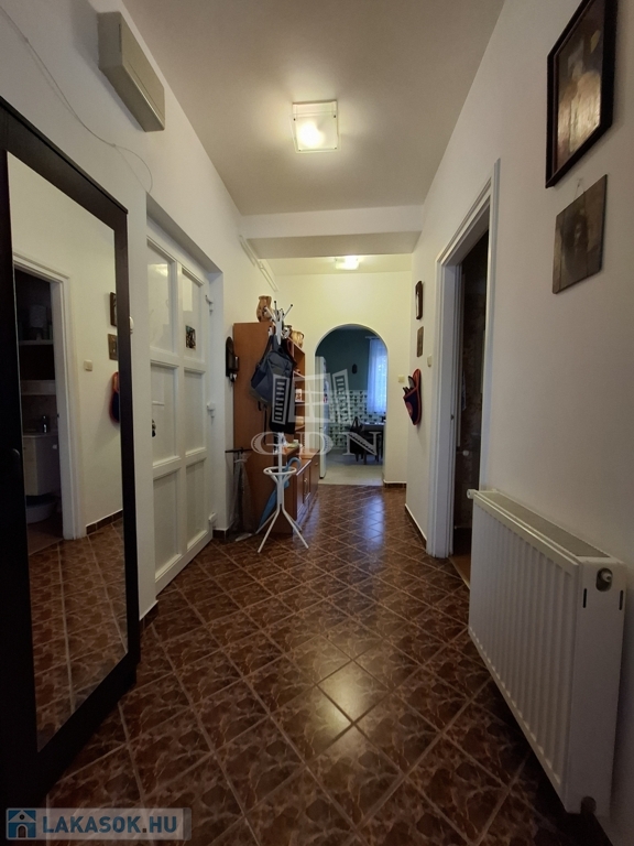 Elosztása: előtér 5,8 m2, konyha/étkező 11,1 m2, szoba 12,1 m2, szoba 17,3 m2, fürdőszoba 3,8 m2, wc 1,06 m2, terasz 4 m2, pinceszinten közös tároló.van.