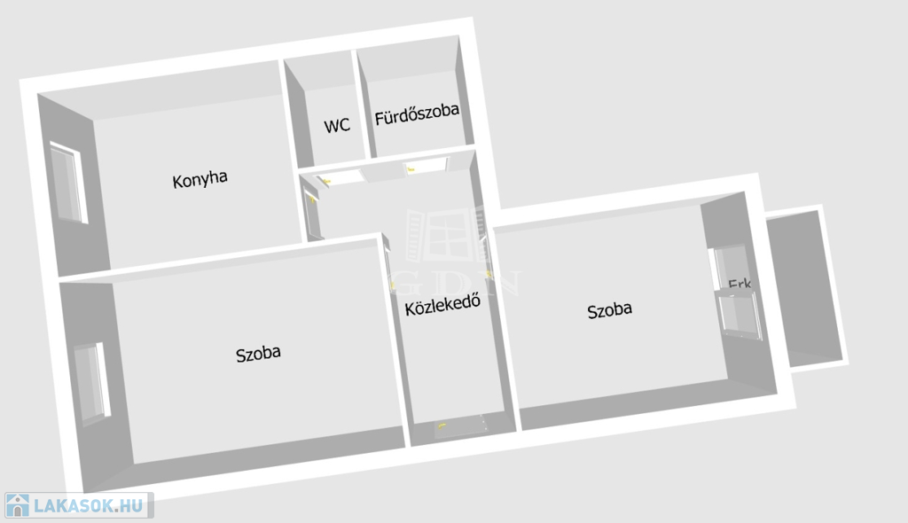 - a lakásban találunk 2 tágas, nagy méretű szobát, nagy méretű konyhát (étkezővel együtt), zuhanyzós fürdőszobát, külön wc-t, valamint egy közlekedőt