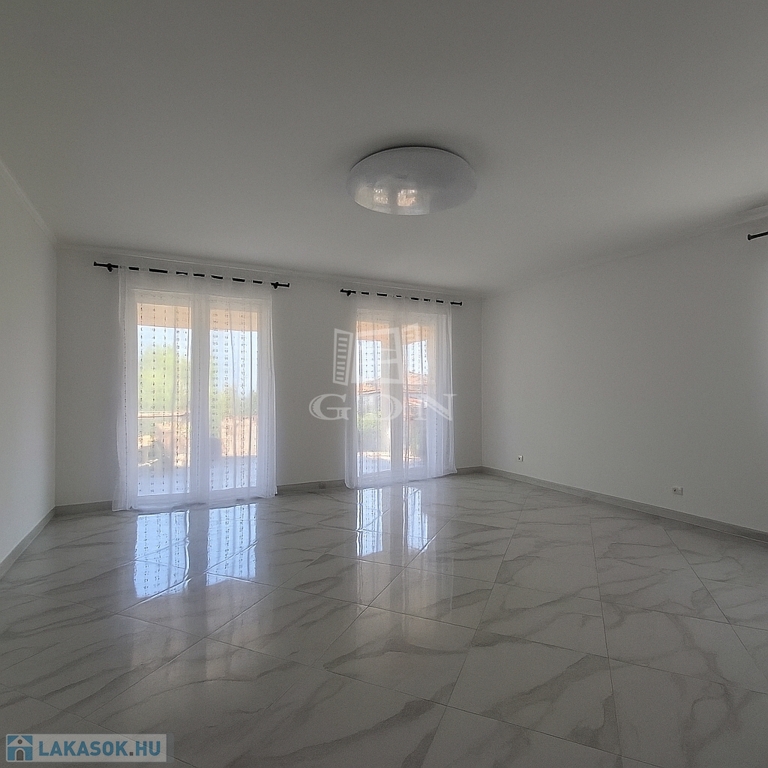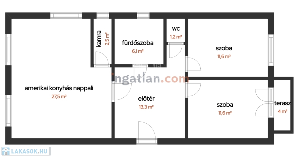 Elosztása: előtér 13,5 m2, amerikai konyha nappali 27,5 m2, szoba 11,6 m2, szoba 11,6 m2, fürdőszoba 6,1 m2, wc 1,2 m2, erkély 4 m2, pinceszinten közös tároló.