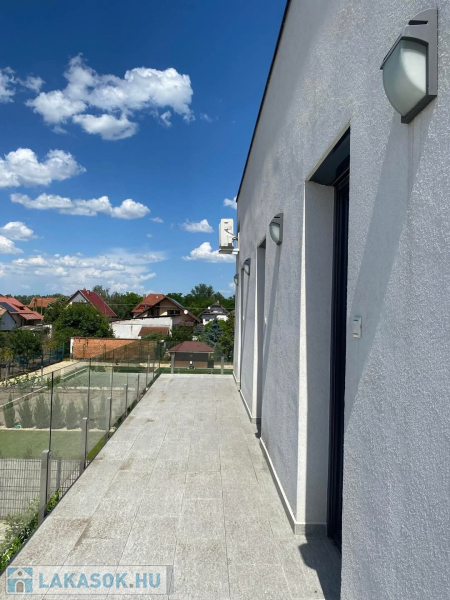 Az otthont egy közel 36 m2-es terasz öleli körbe, így a teraszra nem csupán a nappaliból, de a szobákból is külön ajtó nyílik. A parkolás az épület előtt, illetve a parkosított udvarban is egyaránt lehetséges.