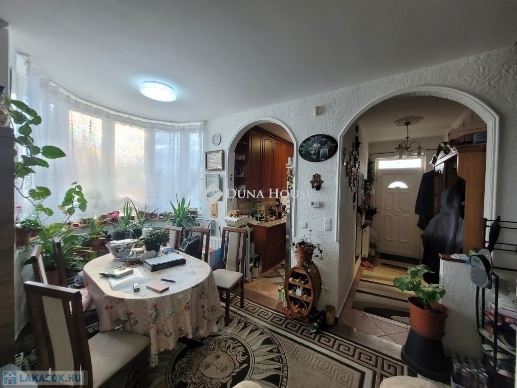 Sziklakertek és kerti tó szomszédságában szépen térkövezett udvaron, tuják között jutunk el a bejárati ajtóig. Az előszobába érkezve balra tágas, világos fürdőszoba található. Továbbhaladva jutunk a nappaliba, amelynek ékköve a jobb oldalon elhelyezkedő, félköríves beugró. Az ablakokon át beáradó természetes fény szinte körülöleli a teret, mely ideális étkezőként vagy olvasósarokként is szolgálhat.