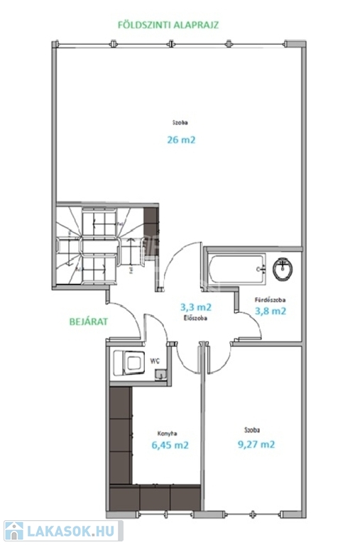 Az alsó szint központja a tágas, 26 m2-es nappali-étkező. Az előtérből nyílik a külön konyha – amely egy kisebb étkezősaroknak is helyet ad –, valamint egy hálószoba, egy fürdő és egy külön WC.