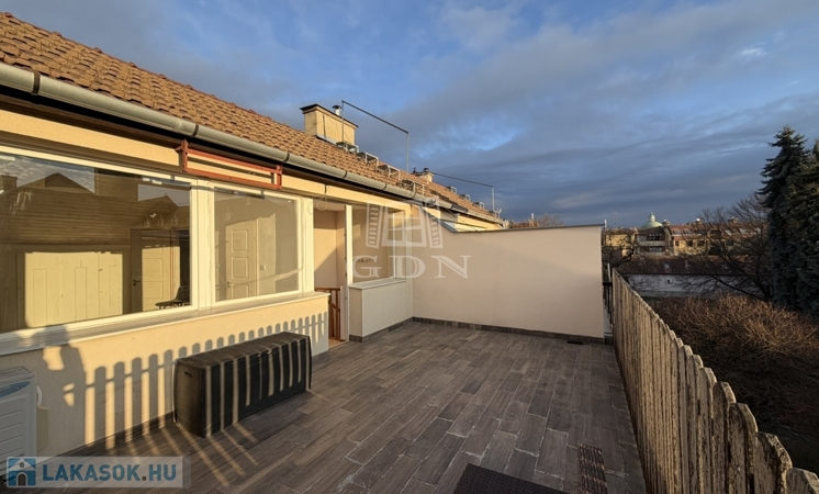 A lakás különlegessége fenti kis előtérből nyíló 26 m2-es, DNy-i tájolású, rendkívüli kilátást biztosító tetőterasz, amelyet tetőtér megnyitásával tudtak megvalósítani.