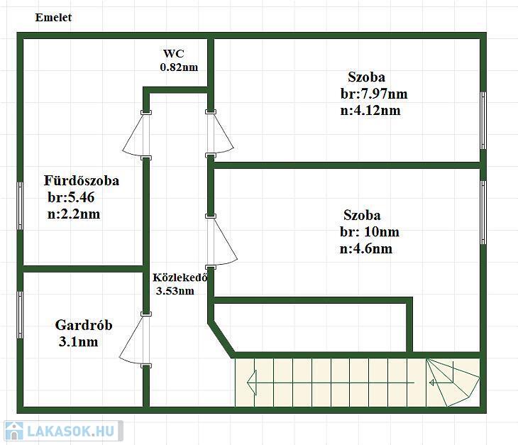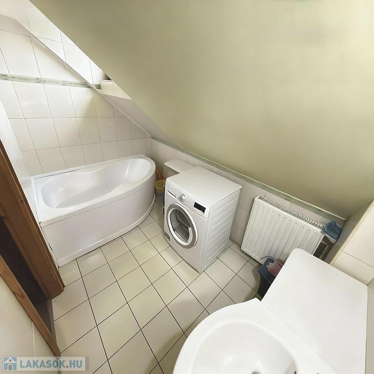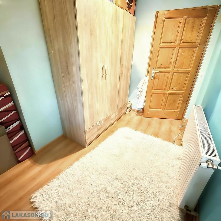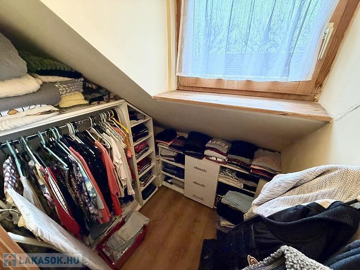 Az emeletre érve egy külön gardróbszoba biztosít kényelmes tárolási lehetőséget, továbbá két külön nyíló szoba kapott helyet, amelyek kiválóan alkalmasak hálónak, gyerekszobának vagy dolgozónak. A fürdőszoba WC-vel szintén az emeleten található. A lakás minden helyiségében új, dupla üvegű, redőnnyel ellátott nyílászárók gondoskodnak a megfelelő szigetelésről és a kellemes hőérzetről.