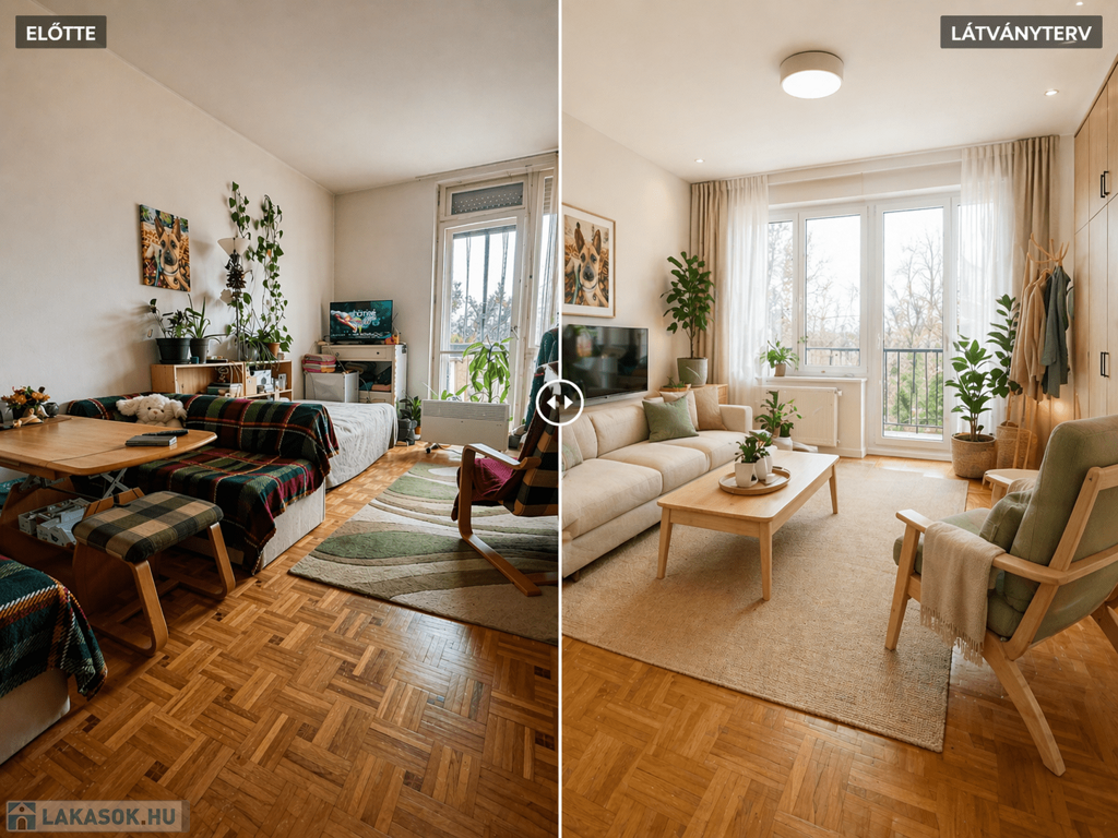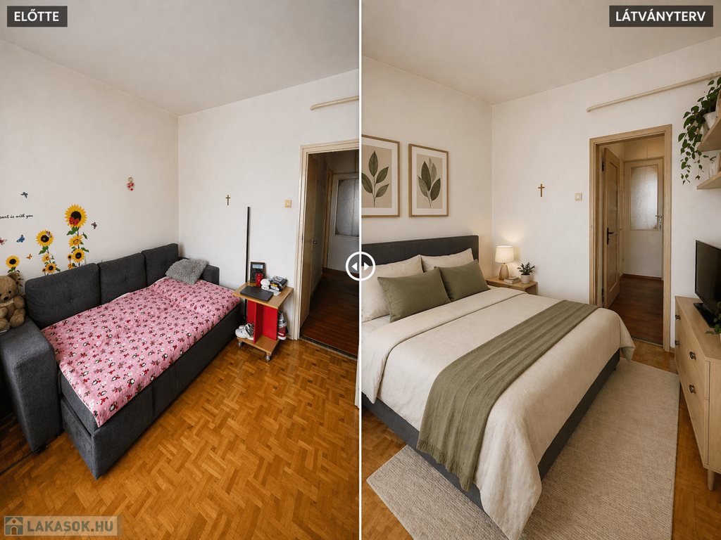 A lakás praktikus, jól alakítható, de jelenlegi elrendezése is kiváló, két külön nyíló szobával, ami remek alapot ad egy modern, élhető tér kialakításához.
