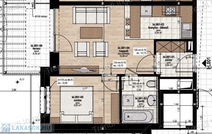 A meghirdetett földszinten található 42,40 nm-es lakásban amerikai konyhás nappali, szoba, fürdőszoba, előtér található. A nappaliból 8,76 nm-es terasz és 21,45 nm-es kertkapcsolat nyílik.