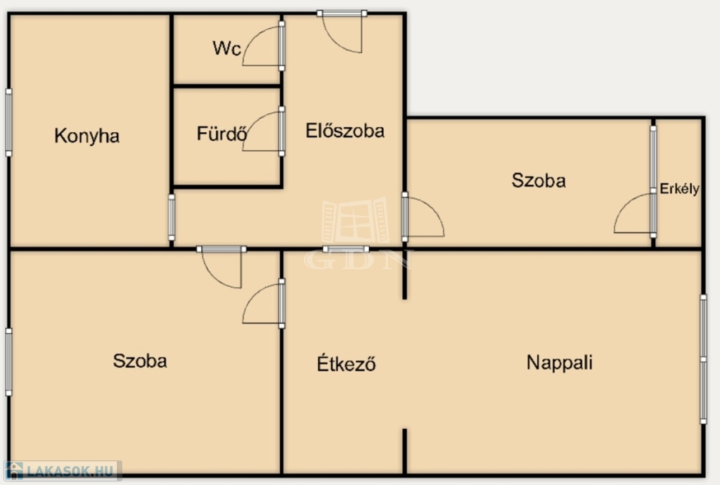 kényelmes elrendezés hallal, külön WC-vel és beépített erkéllyel.