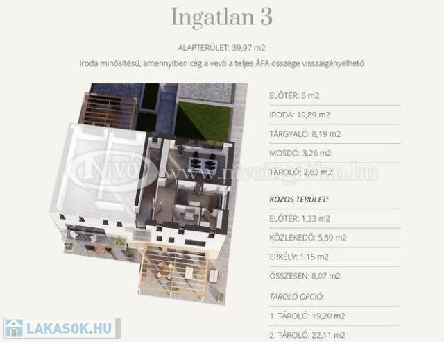 A hirdetésben szereplő lakás (iroda minősítésű) a hármas számmal megjelölt, amelynek alapterülete: 39,97 m2. Az adott albetét iroda minősítésű, de igény esetén lakhatási célra is alkalmas. Ennél az albetétnél céges vásárlás esetén a teljes ÁFA tartam visszaigényelhető. Az árban az épület előtt gépjármű parkolására alkalmas felszíni parkoló is van. Kulcsrakész ár: 60 millió Ft.