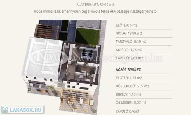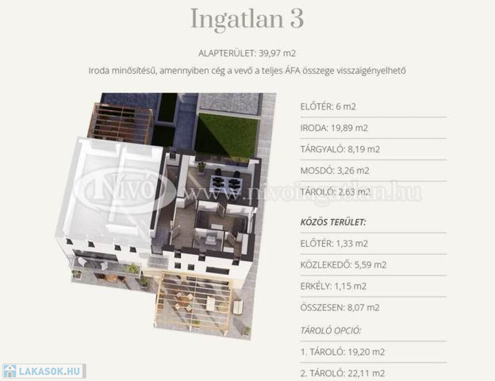 A hirdetésben szereplő lakás (iroda minősítésű) a hármas számmal megjelölt, amelynek alapterülete: 39,97 m2. Az adott albetét iroda minősítésű, de igény esetén lakhatási célra is alkalmas. Ennél az albetétnél céges vásárlás esetén a teljes ÁFA tartam visszaigényelhető. Az árban az épület előtt gépjármű parkolására alkalmas felszíni parkoló is van. Kulcsrakész ár: 60 millió Ft.