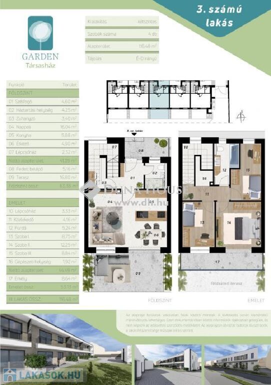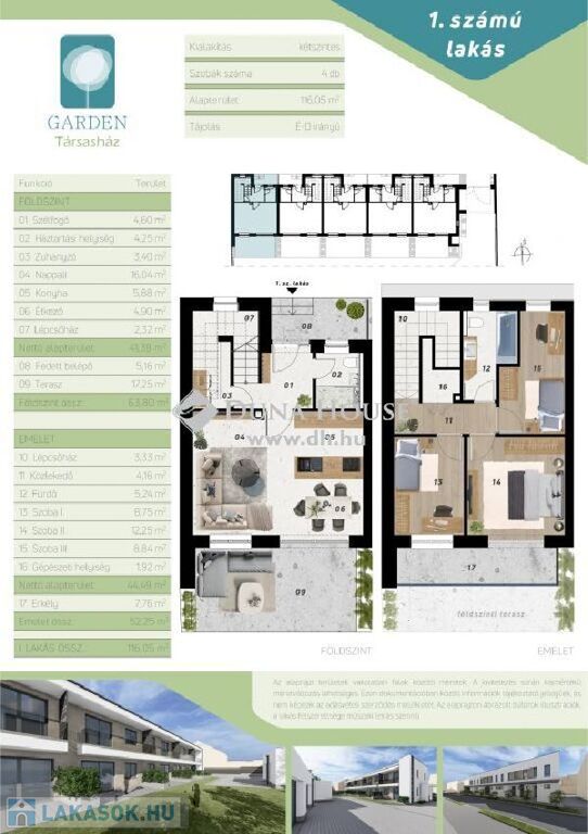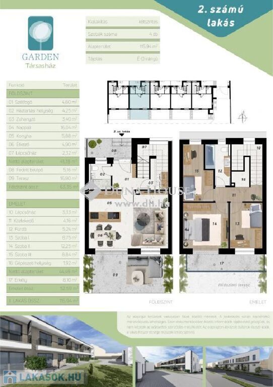 A projekt keretein belül 5 db lakóingatlan épül. Mindegyik belső két szintes. Az alsó szinten a bejárat mellett helyet kapott az egyik oldalon egy zuhanyzós fürdőszoba WC-vel, a másikon a lépcsőtér. A nappali-amerikai konyha minden lakásnál tágas és napfényes D-i tájolásából adódóan. Innen nyílik a térkövezett terasz.