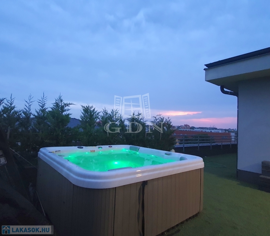A lakás ékét, egyediségét jelentő, fantasztikus kilátással bíró teraszra több helyiségből is kijuthatunk, ahol a 7 személyes JAKUZZI is helyet kapott a kerti bútorok, a grillező és a focikapuk mellett, melyek mind a kellemes időtöltést biztosítják.