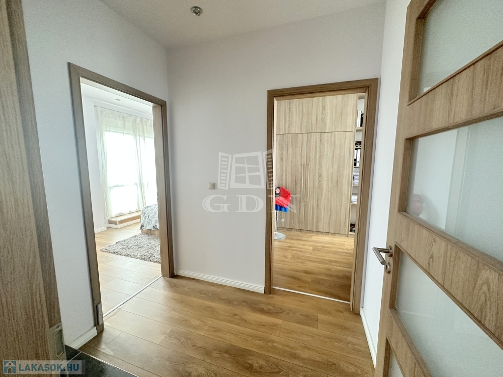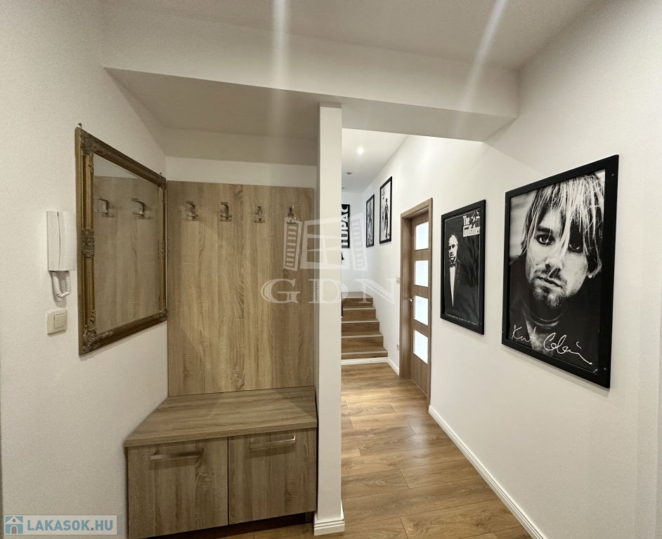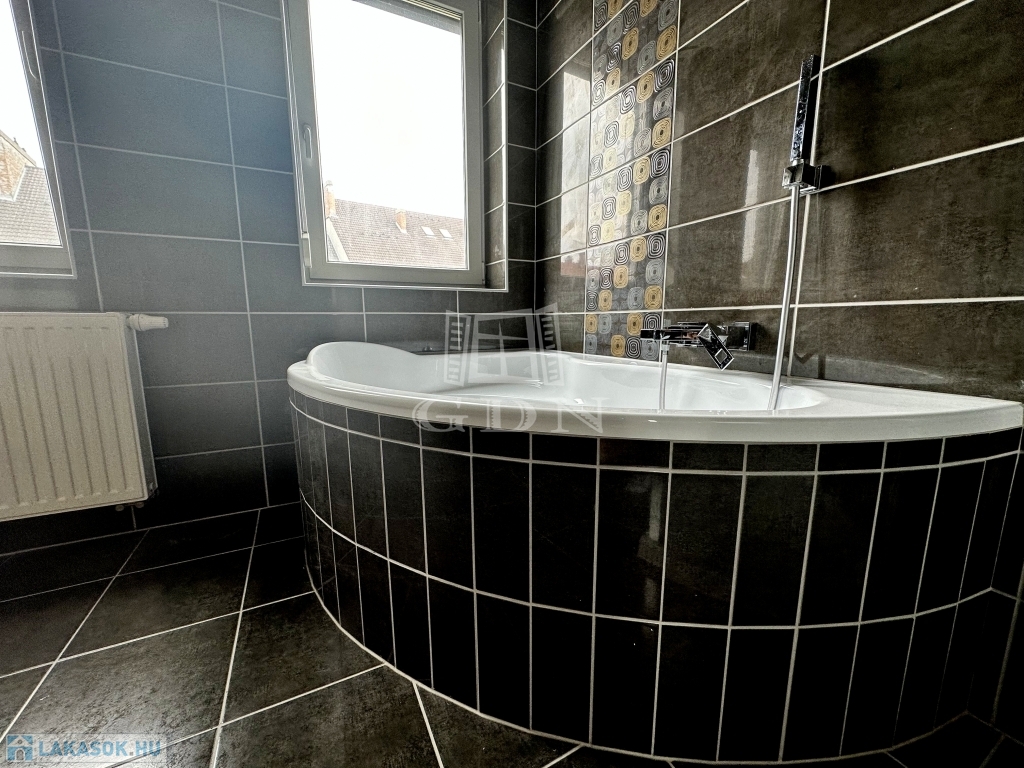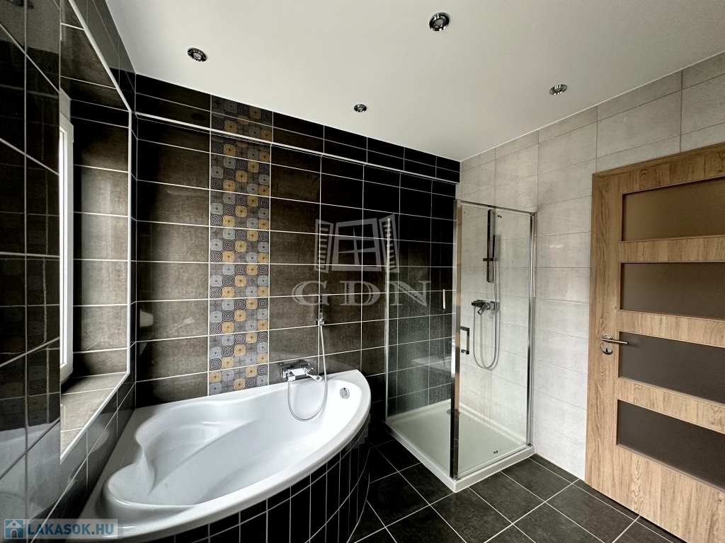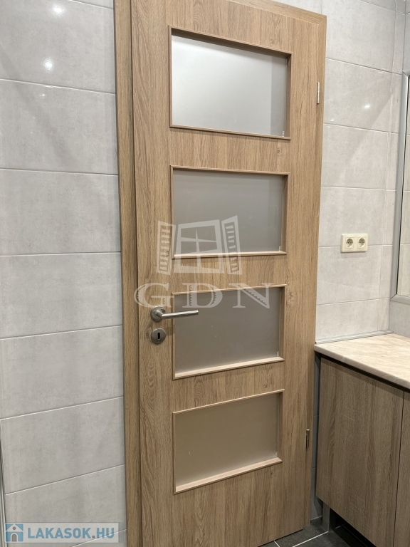 Az ablakok többrétegű műanyag nyílászárók, elektromos redőnnyel ellátottak. A hideg-meleg burkolatok új állapotnak örvendnek, a belső ajtók minőségi, tejüveggel ellátottak. A világításról beépített Spot lámpák gondoskodnak.