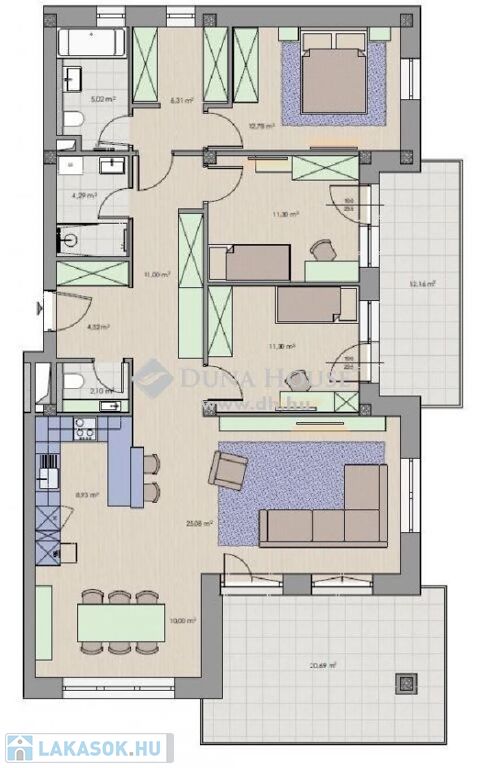 A lakások 3-4 szobásak, minden lakás déli vagy nyugati tájolású, nagy teraszos, a teraszok nem néznek egymásra.