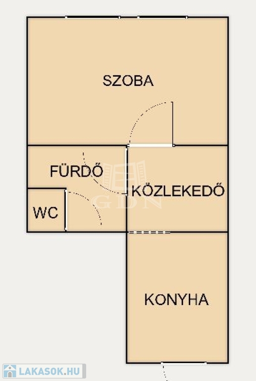 A földszinti ingatlan 38 négyzetméteres, egy szobás kialakítású. A nagyméretű szoba lehetővé teszi egy kényelmes méretű hálósarok leválasztását, így külön nappalihelység is kialakítható, akár a köztlekedő összenyitásával is. Fördőszobája zuhanyzóval és külön ajtóval leválasztott mellékhelységgel felszerelt.