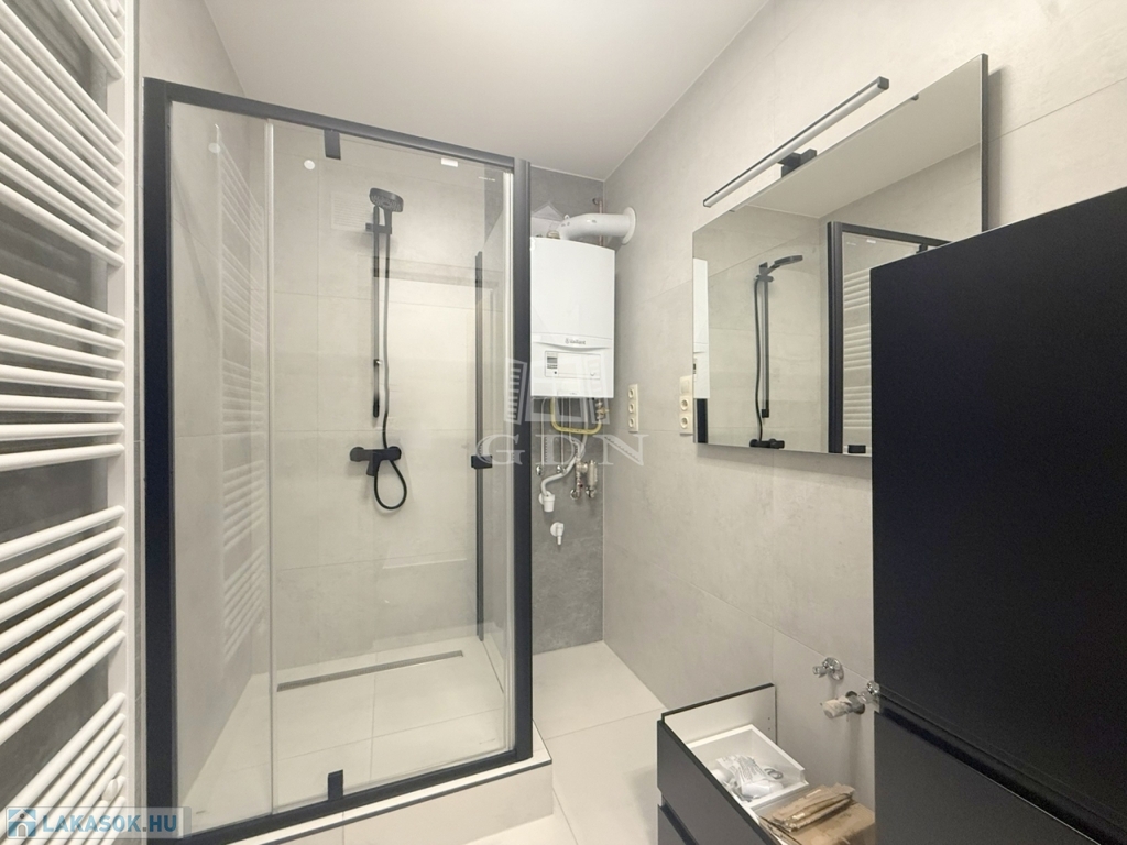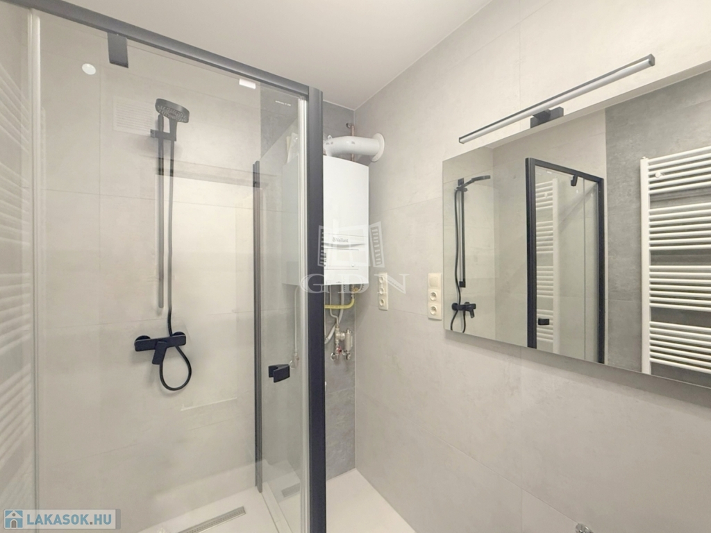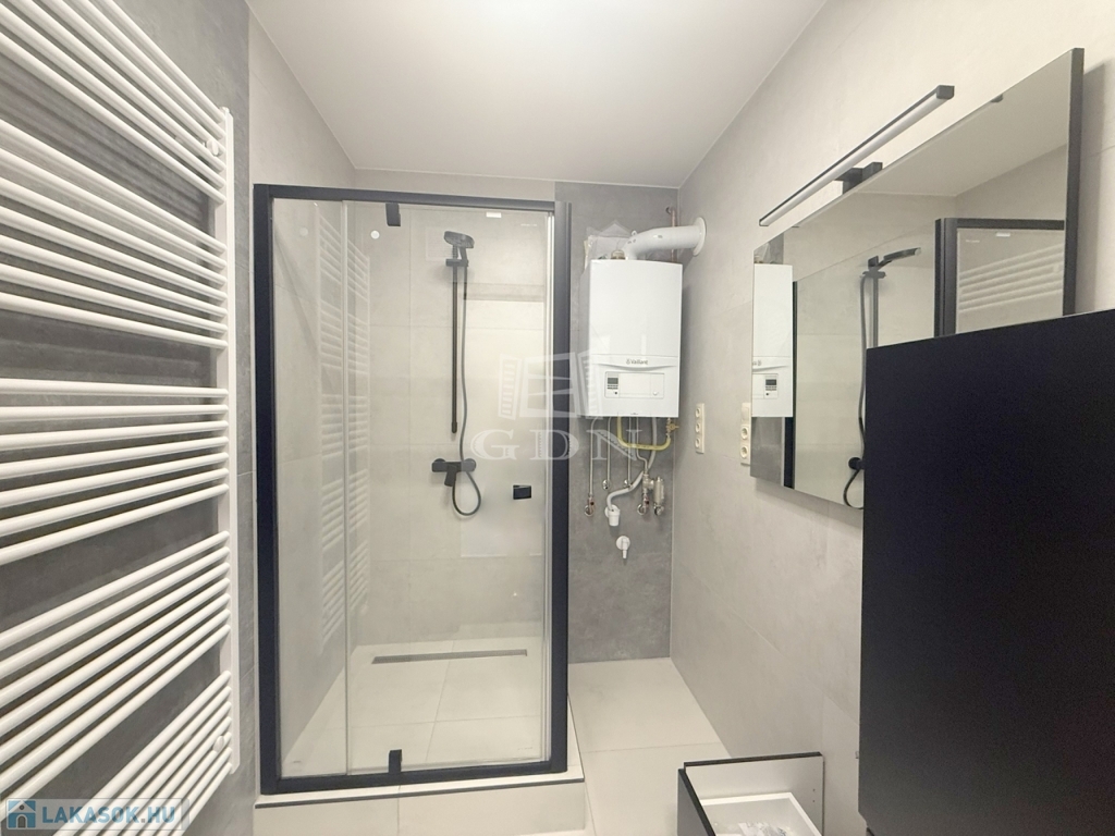 A világos ingatlan melegvízellátásáért és melegéért egy új gázkazán felel, utóbbi lapradiátor hőleadókal, melynek alternatívájaként a mindkét hálóban található inverteres hűtő - fűtő klíma használható.