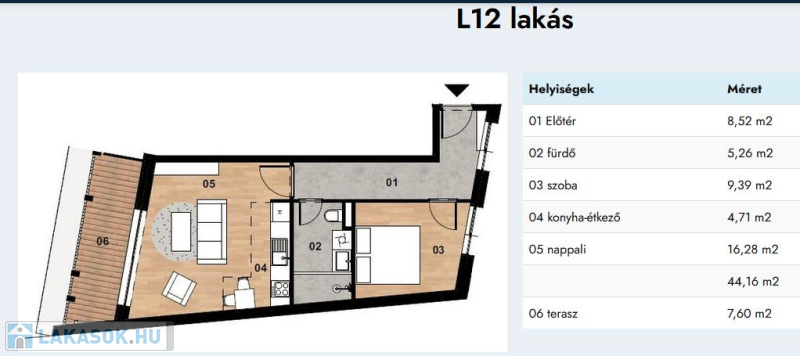 - 44,16 négyzetméter, alacsony energiaigényű, 7,6 négyzetméteres terasszal