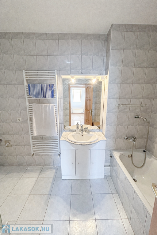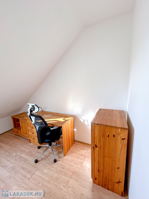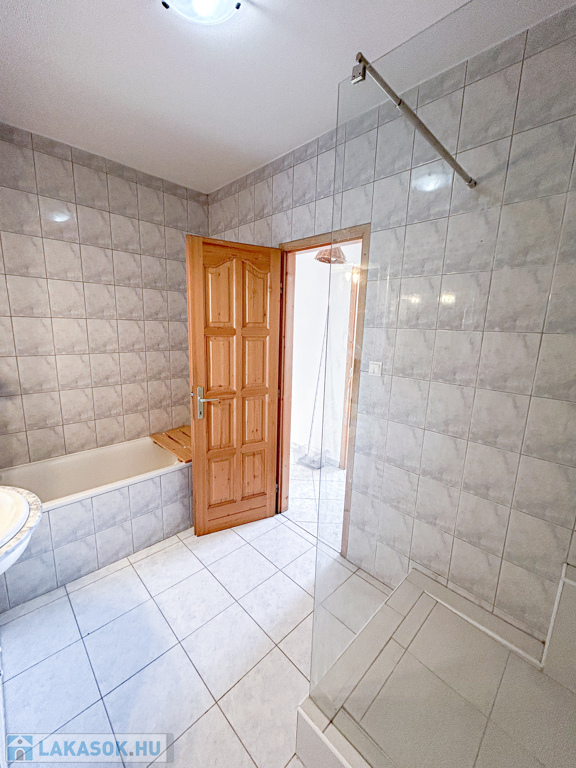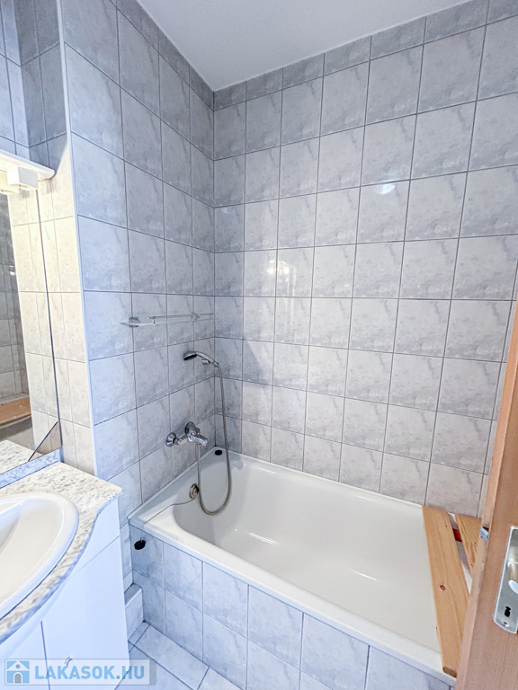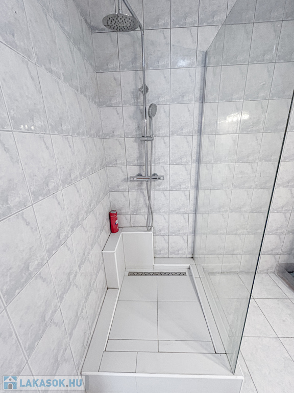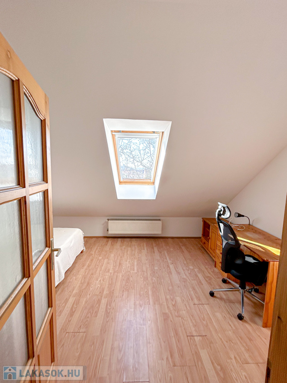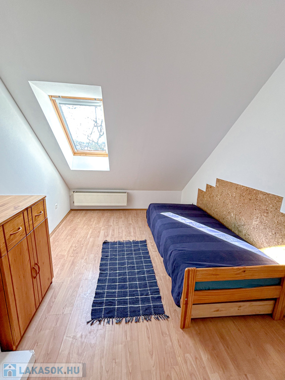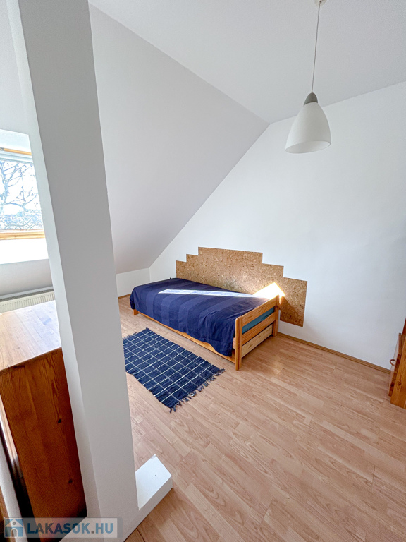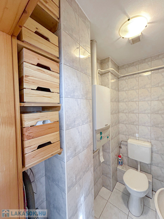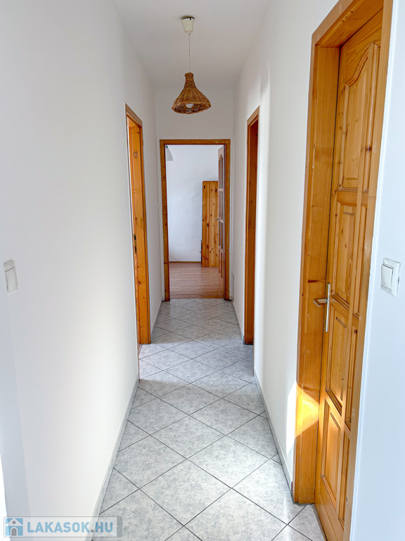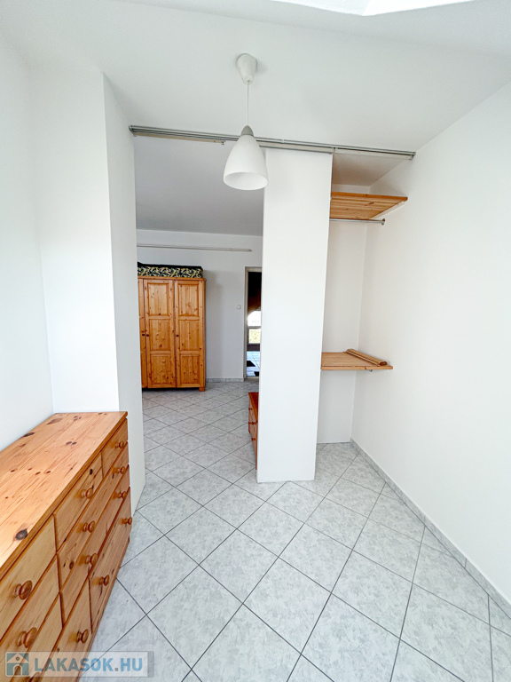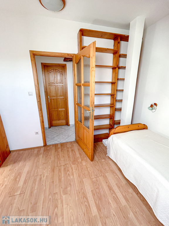 A nappali-konyha részből egy kis közlekedőn keresztül közelíthető meg két nagyméretű, jól berendezhető hálószoba, továbbá a fürdőszoba, amely káddal és egyedi épített, üvegfalas zuhanyzóval is felszerelt. A különálló toalettben kapott helyet a gázcirkó kazán, valamint további praktikus tárolóhely is rendelkezésre áll.