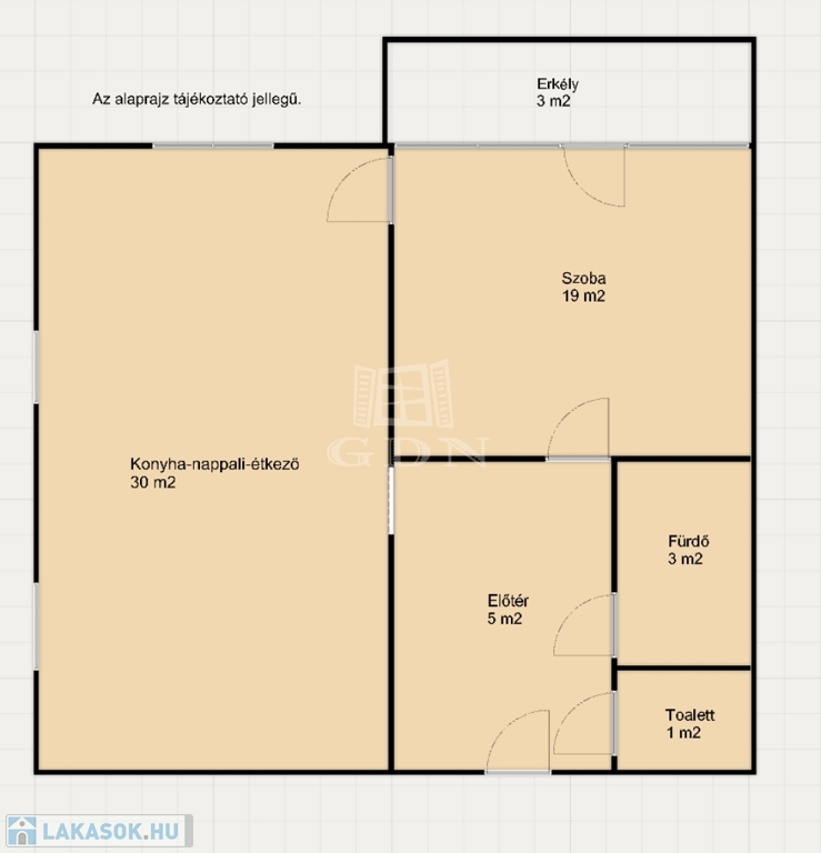 Az 58 m2 - es ingatlan helyet ad egy előtér - folyosónak, egy mindig világos, benapozott 30 m2 - es konyha nappali együttesnek, egy külön nyíló hálószobának, mely erkélykapcsolatos, egy zuhanyzóval felszerelt fürdőnek, valamit egy külön helyiségben található toalettnek.
