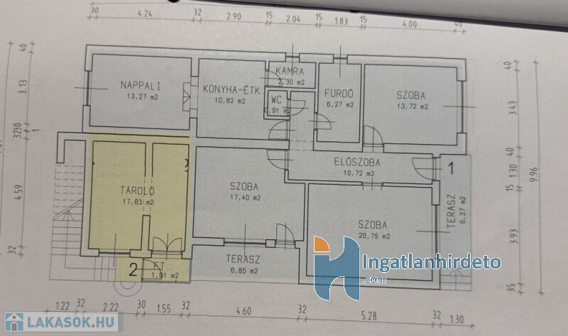 A lakás alapterülete 103 nm, elrendezése 4 szoba, konyha étkezővel, fürdőszoba, WC és kamra.
