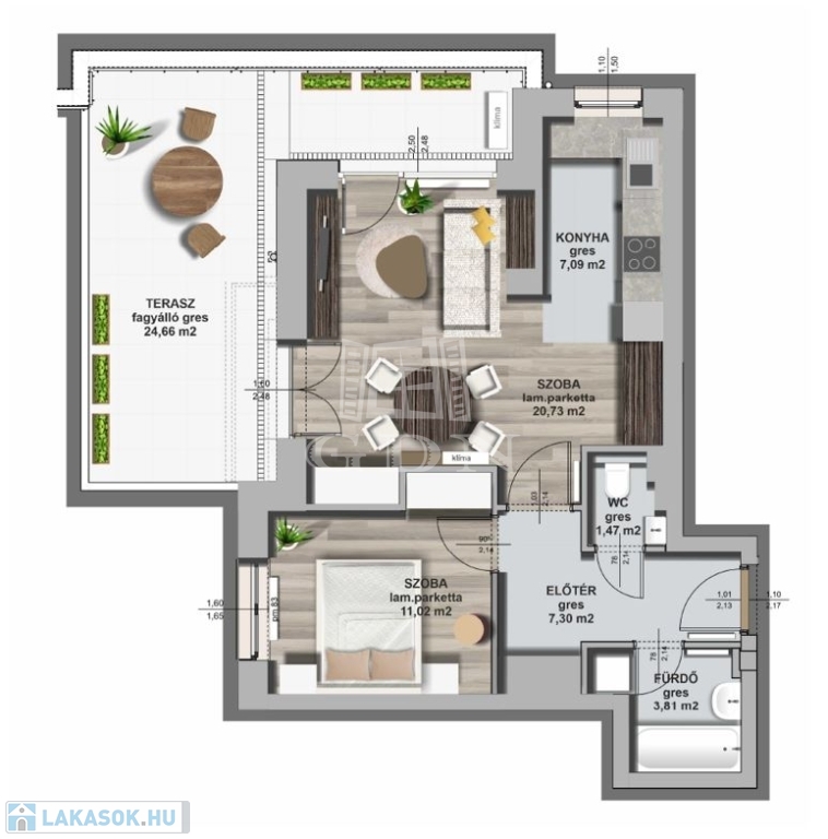 - nagy méretű, 24,66 m2-es terasz