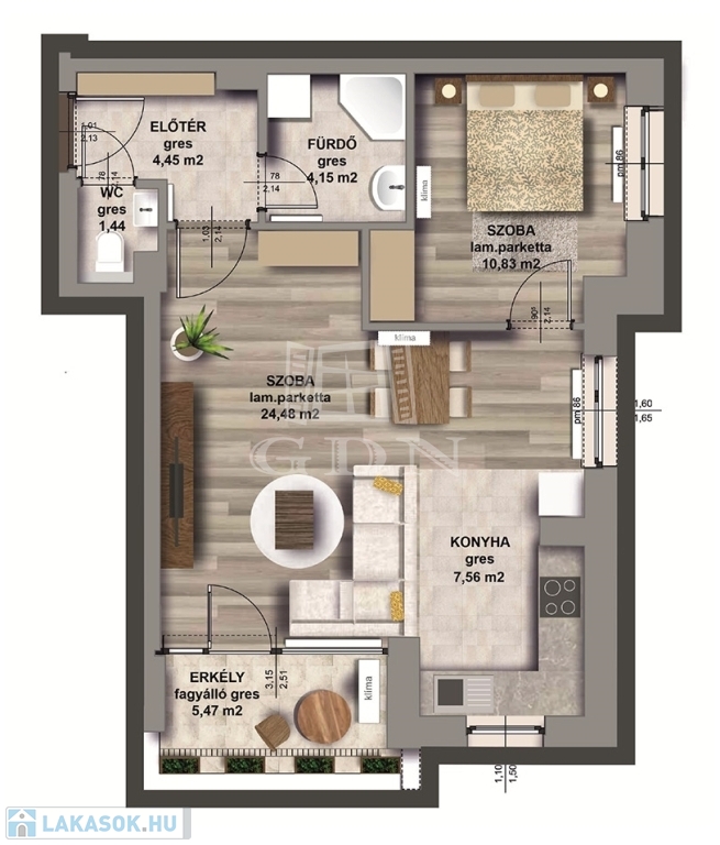 30 db változatos méretű (45-100 m2) prémium minőségű lakás közül lehet választani.