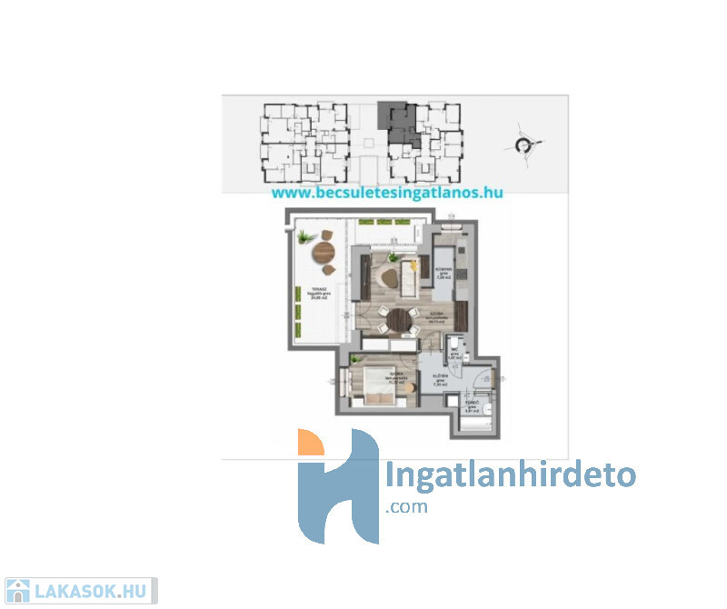 Az eladó Akciós lakás helyiségei és nettó alapterülete: