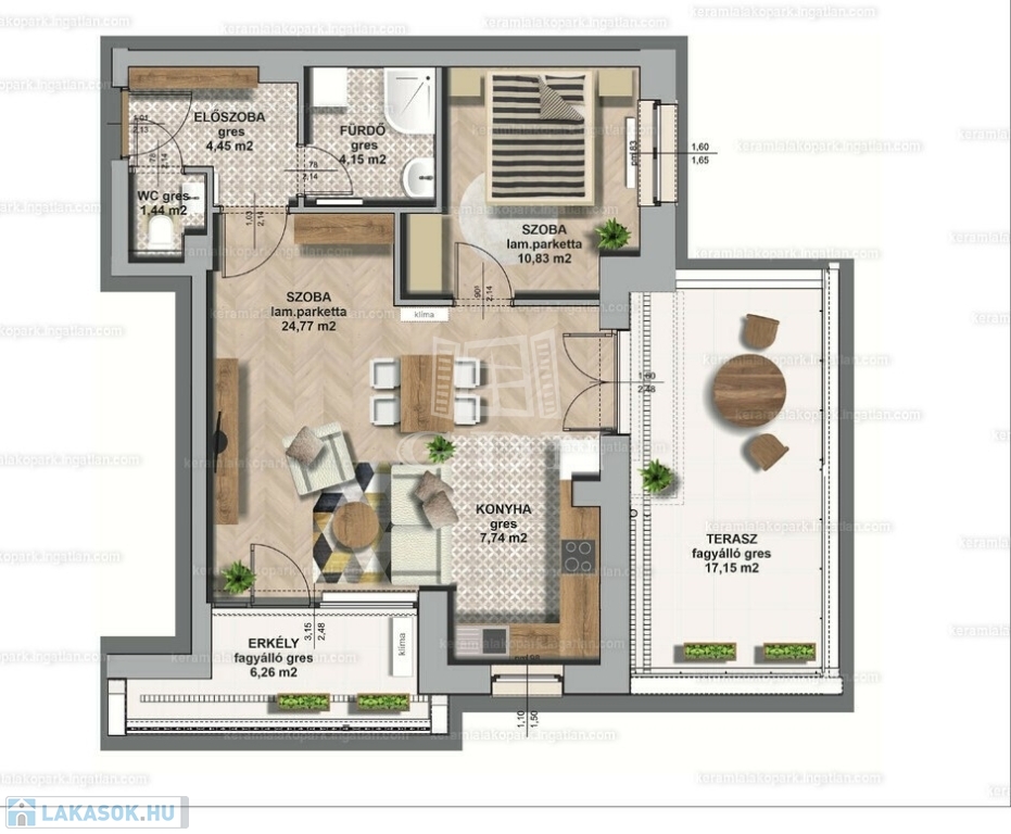 A társasházban 30 db változatos méretű, (45-100 m2) luxus kivitelezésű lakás került kialakításra.