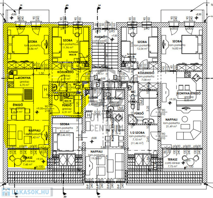 2 hálószoba, nappali, konyha, étkező, fürdő, 2 WC, előtér, közlekedő, terasz elrendezésű.
