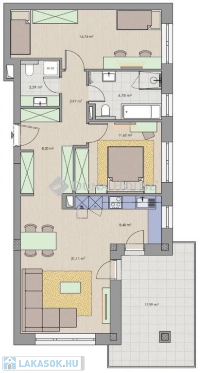 ZALAPART Residence Általános Ismertető:A lakópark egyedülálló adottságokkal rendelkező lokációban épül, közel a belvároshoz, a Zala utcában, közvetlen a Zala folyó partján, a belvárostól mindössze 8 perc séta távolságra, gépkocsival mindössze 2 percre. A közel 1 hektáros, természetközeli, nyugodt, zöld környezetben épülő lakópark épületei egymástól kellő távolságra helyezkednek el, biztosítva ezzel a nyugodt és intim életteret. A projekt keretein belül 4 épület épül, A,B,C és D lépcsőházakkal, összesen 48 lakással. Az A és B épület a Zala utca felől, a telek felső részén fekszik, 2-3 szobás lakásokkal, 54-73 m2 közötti alapterülettel. Szintenként 4 lakás található, valamennyi lakás déli tájolású, a Zala folyó felé néz. A fő tervezési szempont a minél nagyobb hálószobák, az amerikai konyhás kialakítás és a jól használható terasz volt. A C épület a telek alsó részén, a Zala folyó partján fekszik, itt nagyobb, 3-4 szobás, 65-89 m2 alapterületű lakások kerülnek kialakításra, szintenként 3 lakással, kényelmes teraszokkal, a földszinti lakások saját kertkapcsolattal rendelkeznek.A D épület szintén a telek alsó részén, a Zala folyó partján fekszik, itt 2-3-4 szobás, 49-96 m2 közötti lakások kerülnek kialakításra, szintenként 3 lakással, kényelmes teraszokkal. A földszinti lakások saját kertkapcsolattal rendelkeznek.A lakások értékállóságát és kényelmét a városon belüli páratlan elhelyezkedés, az átgondolt tervezés, a minőségi anyagok használata, a nagyméretű, intim teraszok, a lift, a megújuló energia, egyedi és közös tárolók, fedett beállók, garázsok biztosítják. Minden épületben kerékpár- és babakocsi tároló kerül kialakítása, külön tárolók vásárlására is van lehetőség. Az épületek egymástól kényelmes távolságra helyezkednek el, a beépítés szellős, nem túlépített. Az alacsony beépítési mutató mellett a telek nagy része zöldfelület, fákkal, növényekkel betelepített, a lenti épületek között közösségi udvar, park kerül kialakítása. A parkolók térvilágítást, az épületek közötti sétányok díszkivilágítást kapnak mozgás- és alkonykapcsolós vezérléssel.Sok társasházban gondot jelentenek a szűk parkolók és garázsok, ezt figyelembe véve a ZalaPart Residence garázsai és a parkolói kényelmes méretűek, az átlagosnál nagyobbak. A felszíni parkolók 2,6-2,8 m szélesek, a garázsok 16-19 m2 közöttiek, széles kapuval felszereltek. Minden lakáshoz vásárolható felszíni parkoló, illetve ezen felül saját garázs is. Lehetőséget biztosítunk fedett felszíni parkoló vásárlására is, illetve elektromos töltőpont előkészítése is kérhető a garázsokhoz és egyes felszíni parkolókhoz. Kialakításra kerül 1 db társasházi, közösségi elektromos autó töltőpont.Építészeti kialakítás, gépészet:A műszaki tartalomnál a fő szempontok az energiatakarékosság, az alacsony rezsi és a magas műszaki színvonal voltak. Az épületek téglából, helyenként vasbeton szerkezetekből, monolit beton födémmel épülnek, magastetős kialakítással, tetőtéri lakás nem készül. A külső falakra minimum 15-20 cm-es hőszigetelés készül, a nyílászárók 3 rétegű üvegezésű, melegperemes műanyag szerkezetek, kívül fóliázottak, belül fehér színűek .Minden homlokzati nyílászáróhoz vakolt redőnytok kerül beépítésre, a hálószobákban rovarhálóval felszerelt kézi mozgatású, alumínium redőnyökkel. Minden nyílászáróhoz kerül elektromos kiállás a redőnymozgatáshoz, így a motoros mozgatás is könnyen megoldható lesz.A ház fűtése minden lakásban egyedileg szabályozható, levegő-víz rendszerű, négycsöves H tarifás hőszivattyús padlófűtés. A lakásokban az alapfelszereltség részeként, minden szobában Fan-COIL rendszerű, hűtő-fűtő klíma kerül kiépítésre, amely szintén a hőszivattyúról üzemel, így kültéri egységek nem kerülhetnek a házak homlokzatára. A lépcsőházak temperált fűtöttek, a garázsok külön villanyórával felszereltek. Minden épülethez napelem előkészítés is készül. A lakások között és a lépcsőház és a lakás között hanggátló falszerkezet kerül beépítésre, a födémben hangszigetelő réteg kerül az aljzatbeton alá. Ezen hanggátló falak elé ahol szükséges, gipszkarton vagy Ytong előtétfalat terveztünk hangszigeteléssel. A lakásokat megközelítő folyosó a lépcsőháztól távol helyezkednek el, a liftek nem határosak lakással. Belsőépítészet:Minden lakástípusra egyedi belsőépítészeti terv készült, amely érinti a bútorozást, a villamos kapcsolók, dugaljak elhelyezését, a fürdők berendezését és burkolatkiosztását és a belső, egyedi hangulatot, design-t. Az alapos tervezésnek köszönhetően a leendő lakónak már nem kell külön kitalálnia a funkcionális elrendezést, a lakások aszerint lettek finomhangolva, hogy jól élhetőek legyenek és megfeleljenek a mai kor követelményeinek, trendeknek, és ezáltal hosszú távon is értékállóak legyenek. Mire számíthat, ha a ZalaPart Residence-t választja új otthonául?alacsony energiafelhasználású, modern, értékálló otthona leszmagas műszaki felszereltségre (hőszivattyús fűtés, klíma, modern nyílászárók, redőnyelőkészítés, igényes burkolatok)autójával védett helyen parkolhat, tágas, kényelmes parkolóhelyekenparkosított, körbekerített udvarrabiztonságos beléptető rendszerre elektromos kapuval (nem sorompóval)minimum 10 m2-es hálószobákra2 fürdőszobás lakások közül is választhatD-i, vagy Ny-i tájolású, Zala folyóra és a városra néző kilátásrafedett, nagyméretű teraszokrajól bútorozható, illetve saját gardróbos lakásokra Amennyiben fontos Önnek a n