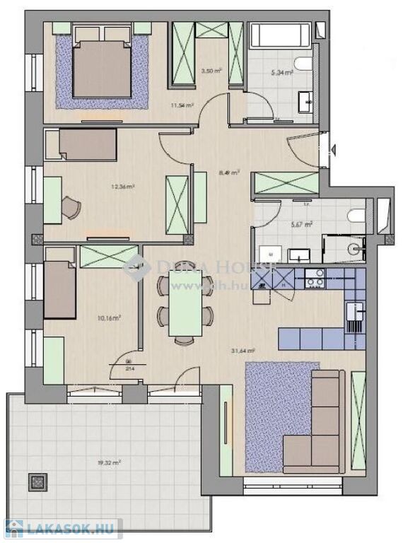 A lakások 3-4 szobásak, minden lakás déli vagy nyugati tájolású, nagy teraszos, a teraszok nem néznek egymásra.