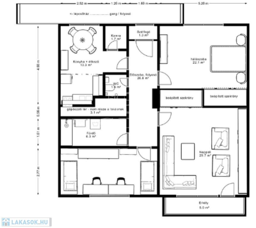 Az ingatlant egy körfolyosón keresztül tudjuk megközelíteni. A lakásba belépve találunk 3 tágas méretű szobát, egy konyha-étkező együttest hozzátartozó kamrával, egy fürdőkáddal felszerelt fürdőszobát, külön helyiségben található mellékhelyiséget, valamint egy tágas közlekedőt.