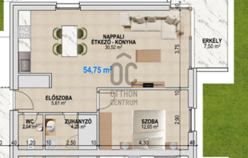Az ingatlan az 1. emeleten helyezkedik el, 54,75 m2 alapterületű + 4,8 m2 erkély tartozik hozzá.