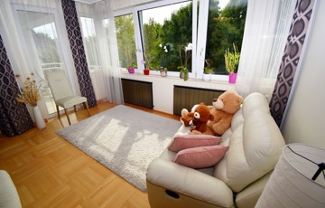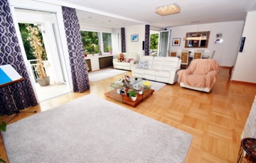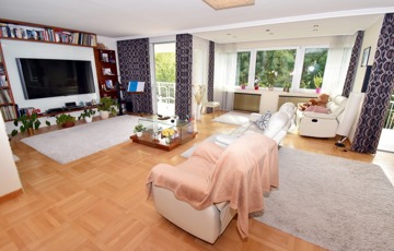 Óriási, napfényben úszó nappali, amely a családi élet központja lehet, közvetlen kapcsolattal a zöldre néző erkélyekhez.